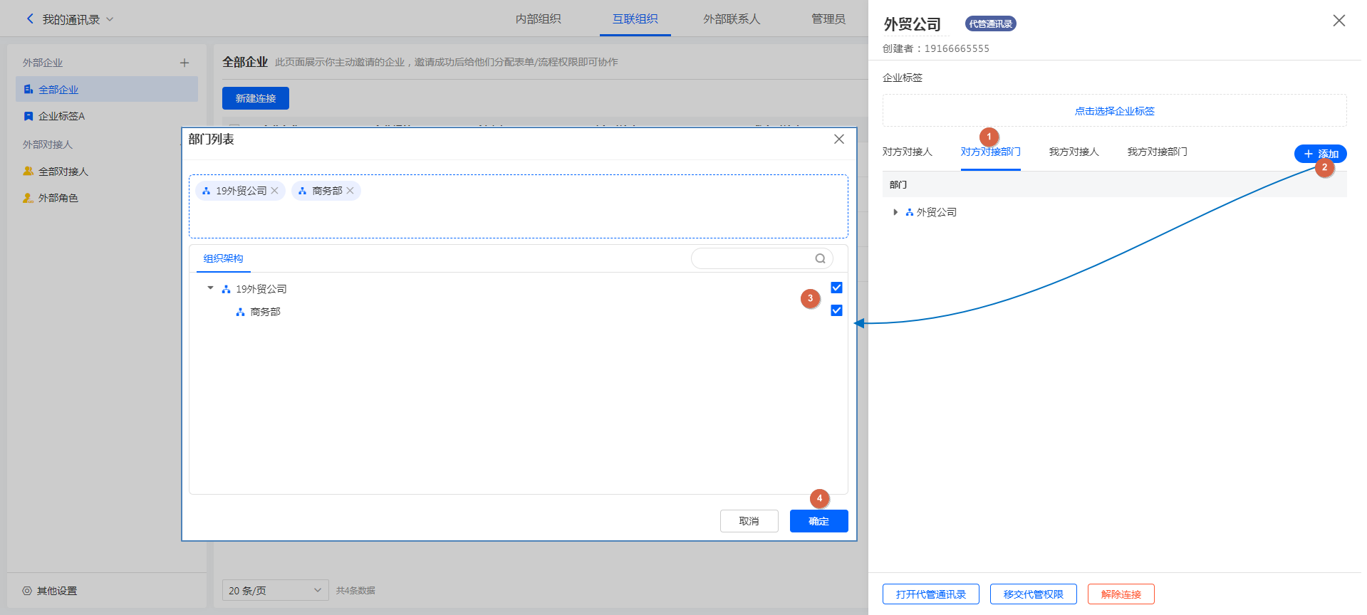 添加对方对接部门