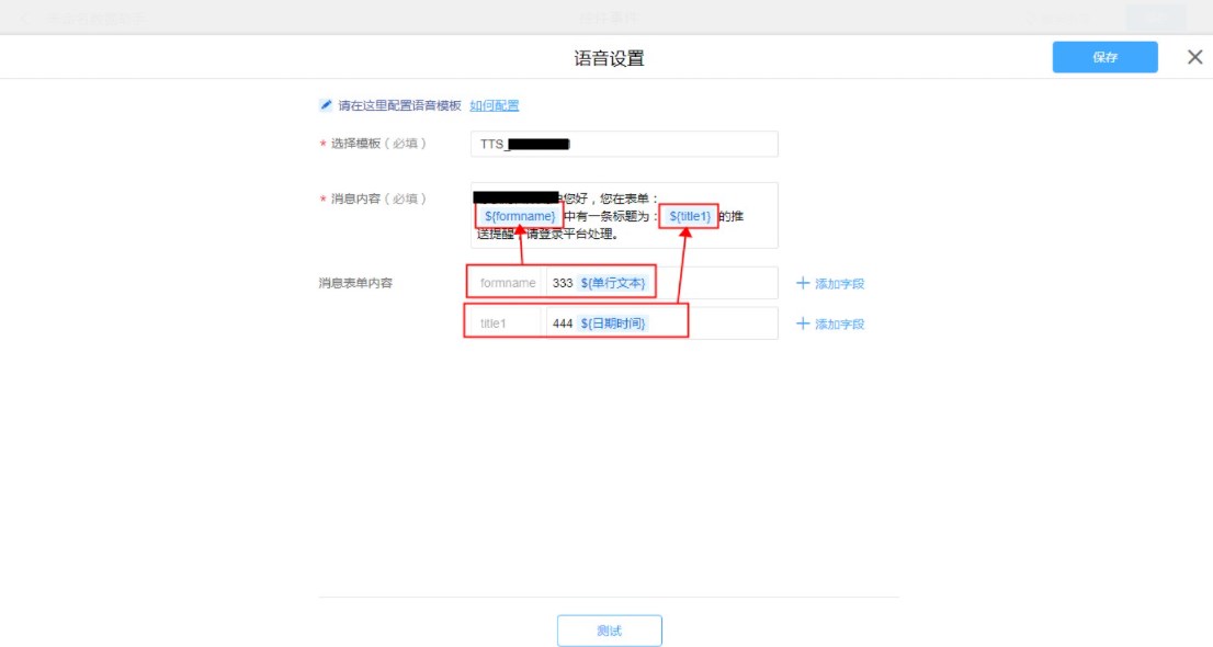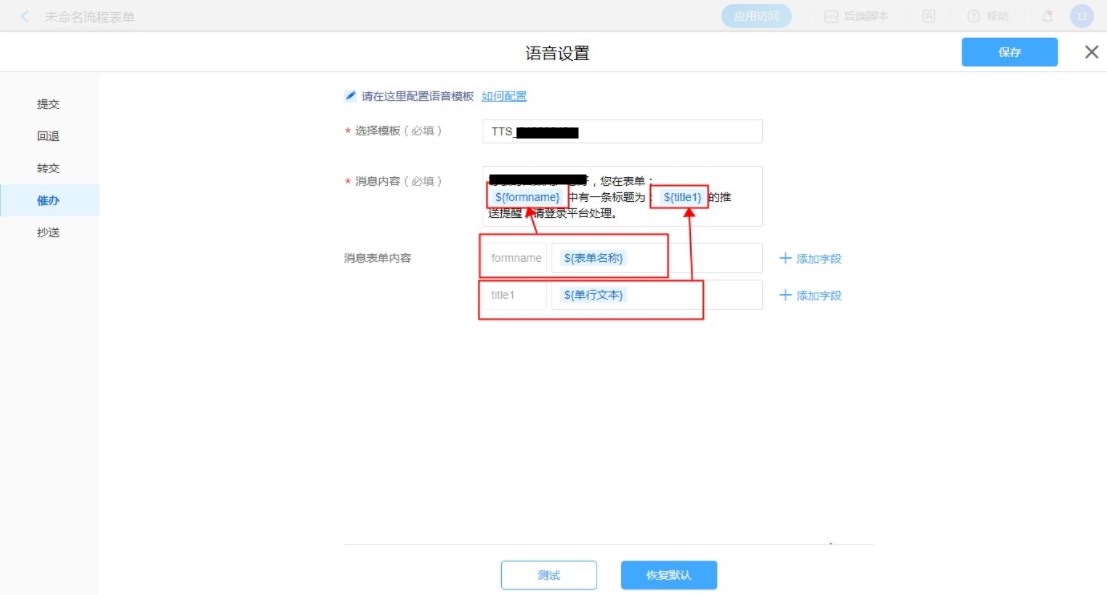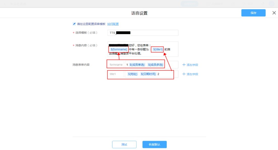 用户在设计流程表单、普通表单、数据助手消息设置时选择语音提醒时,可设置语音消息模板。
