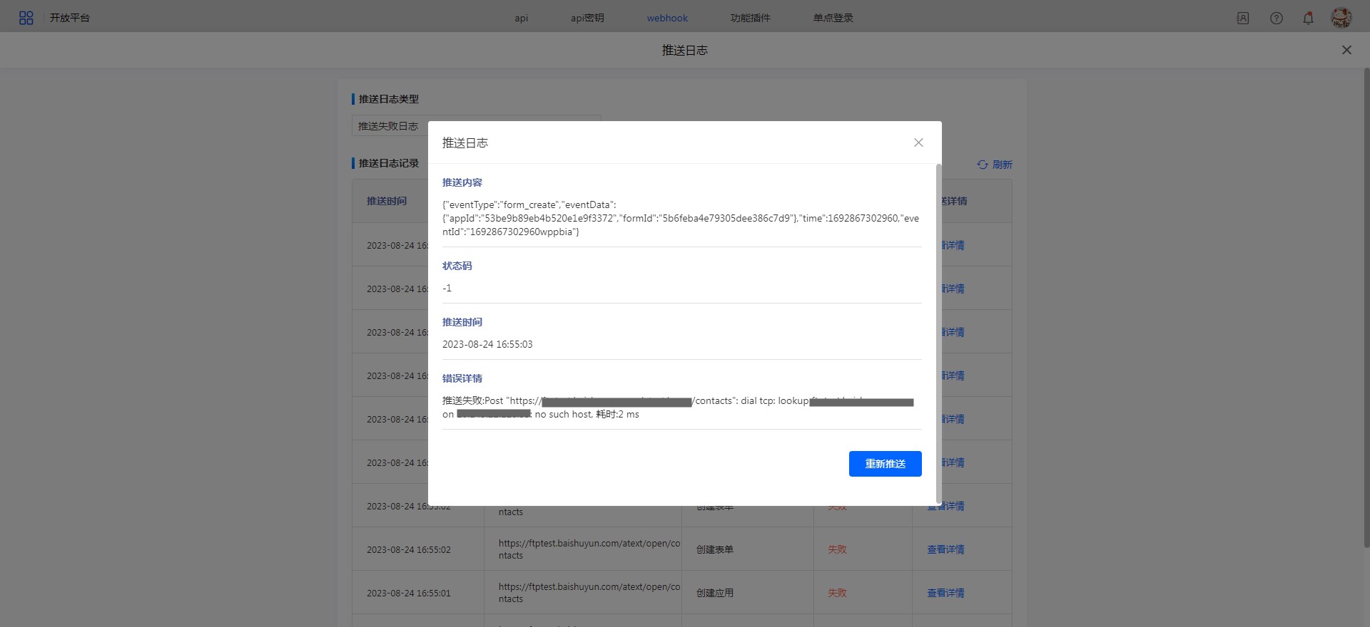 • 推送详情中可以查看到推送内容、状态码、推送时间、错误详情等信息,如果事件推送错误了还以在此处查看到具体信息。