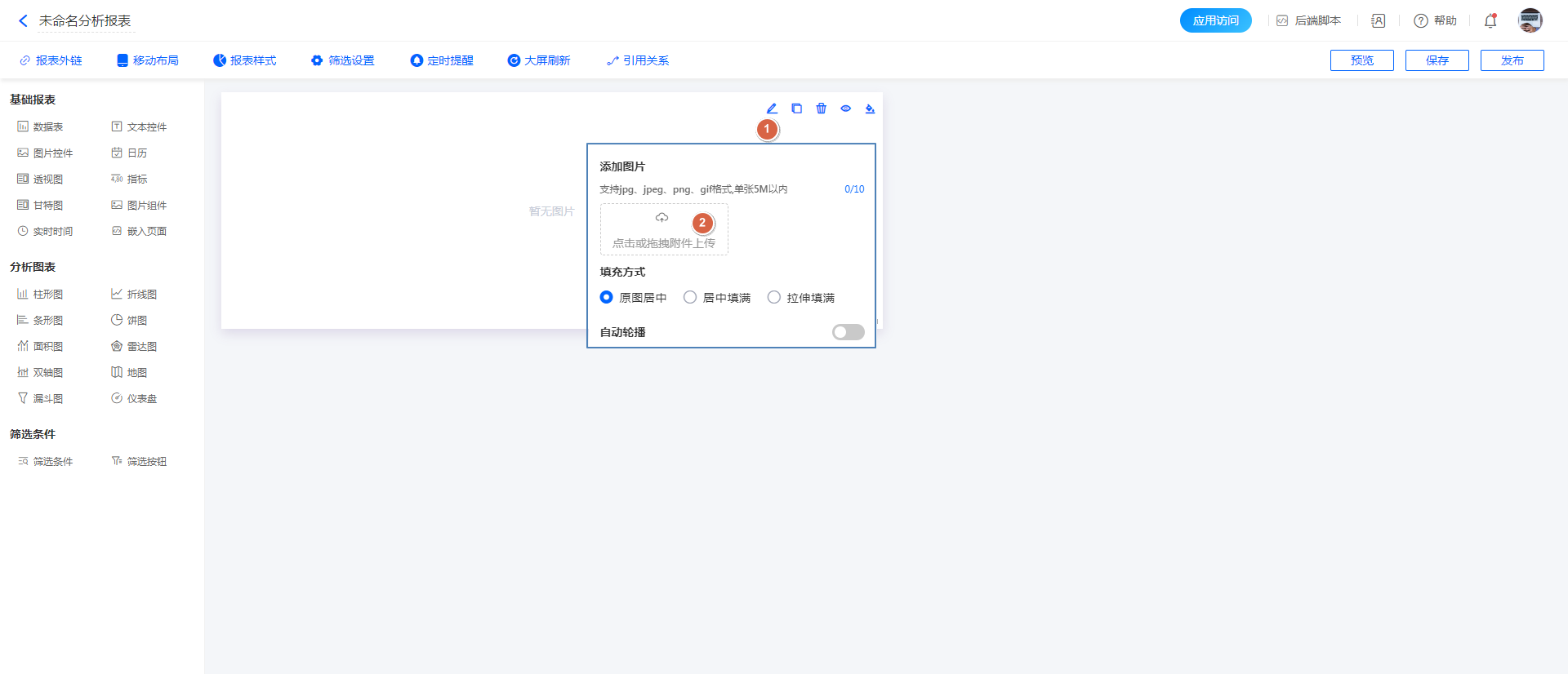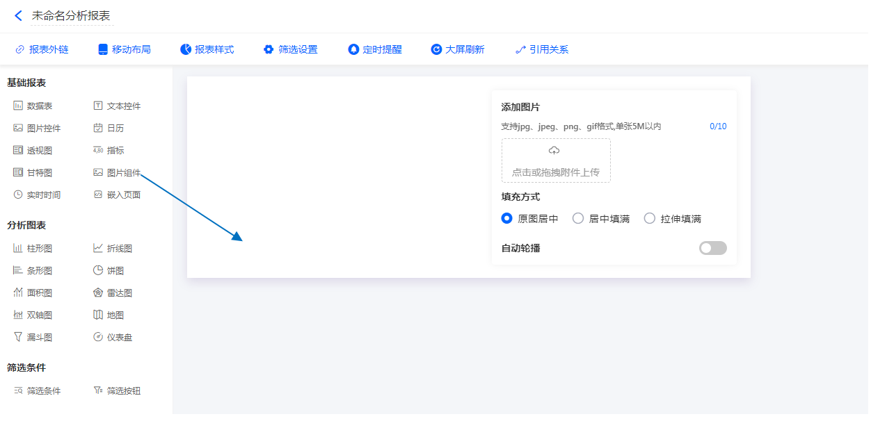 报表设计页面,拖动「图片组件」到报表中,如图:
