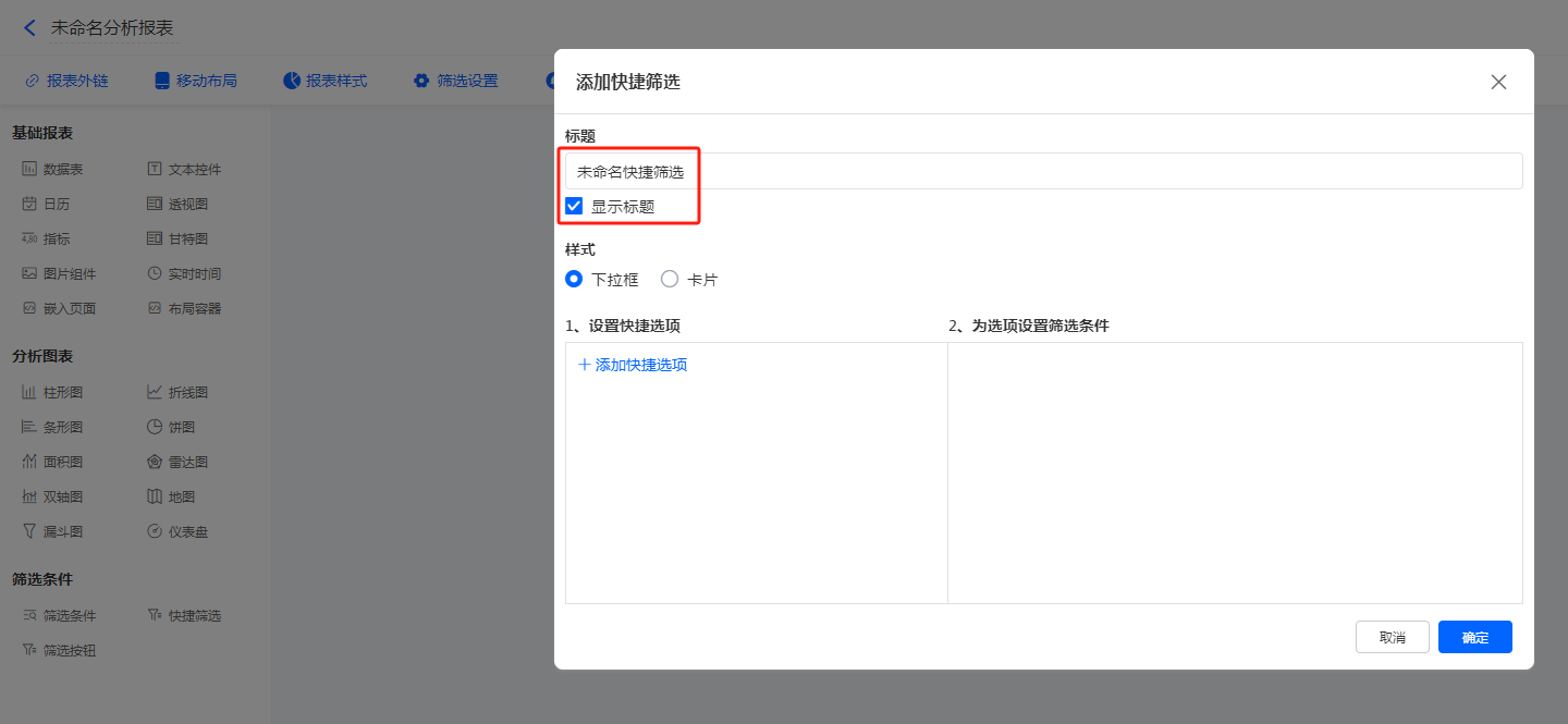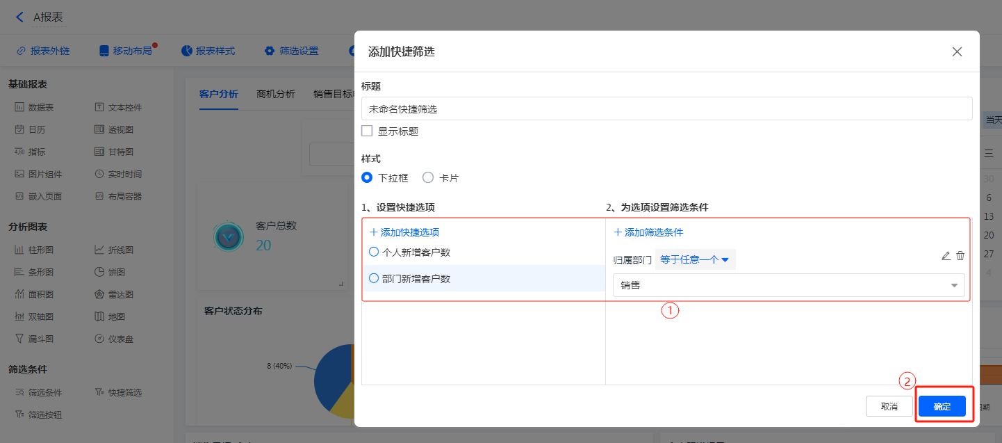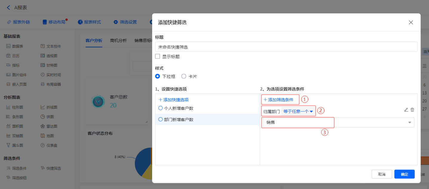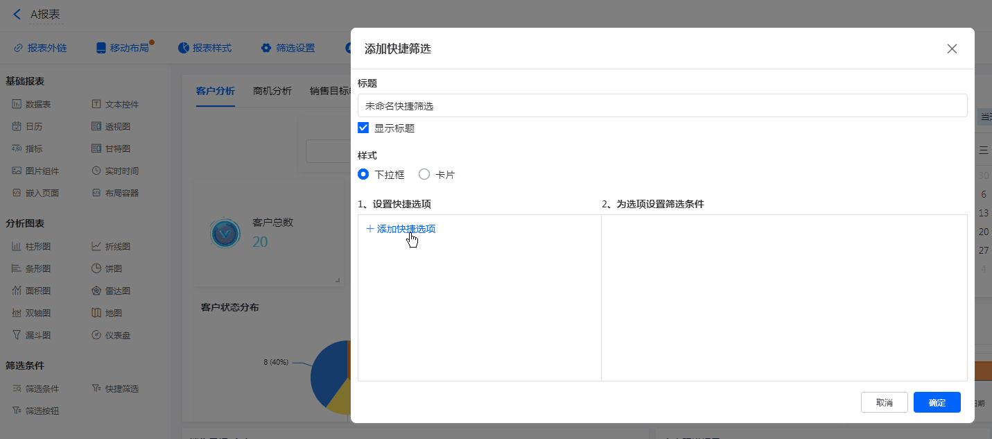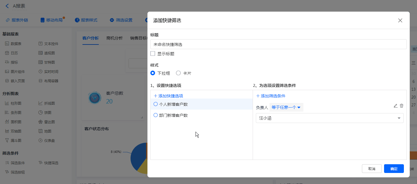 在报表中添加一个「快捷筛选」组件,添加后可以在弹窗中进一步设置组件。如下图所示: