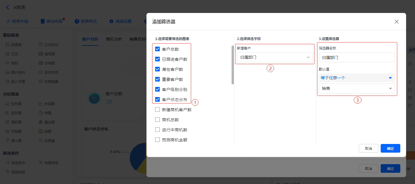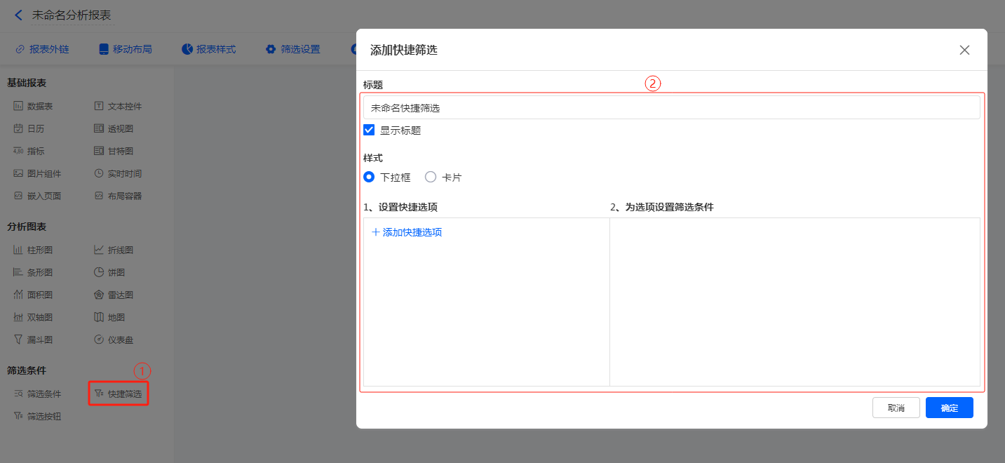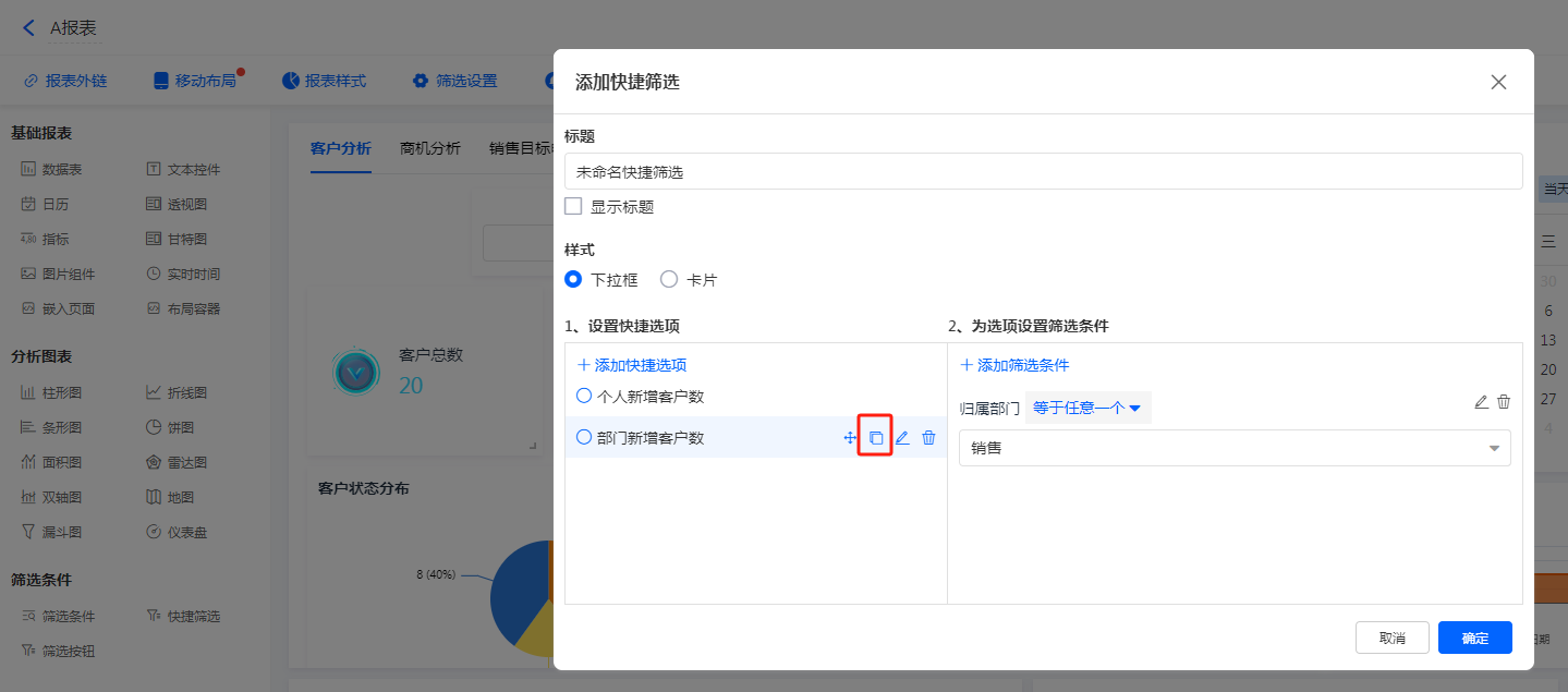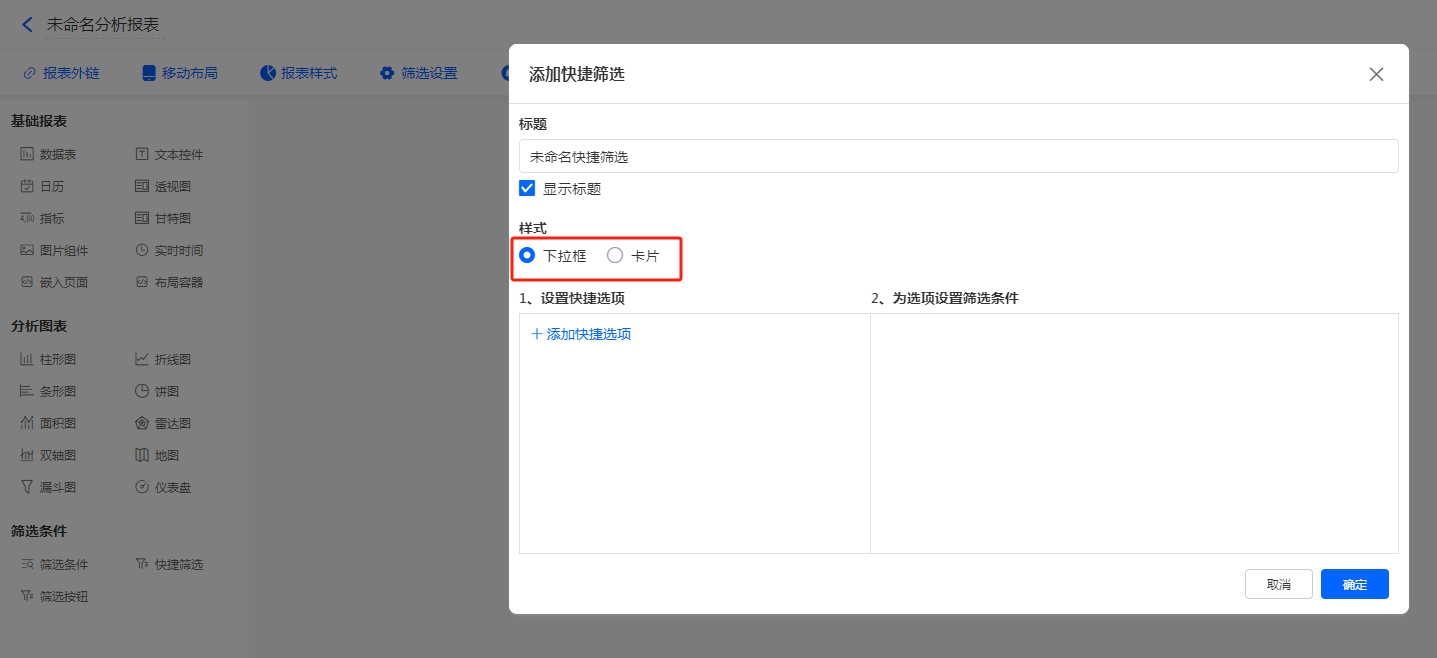 在报表中添加一个「快捷筛选」组件,添加后可以在弹窗中进一步设置组件。如下图所示: