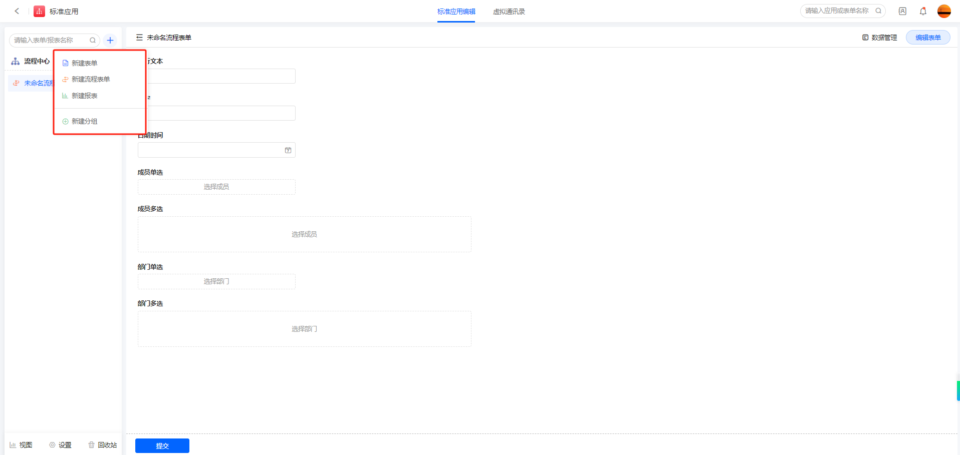 标准应用编辑页面,点击+新建流程表单(用户可根据需要 自行新建各类表单)进行配置。如下图所示: