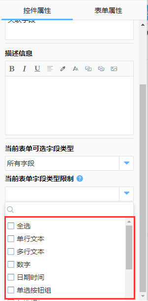 当前表单字段类型限制是限制在模块配置页面当前表单的字段类型,这里勾选相应的字段类型后,将只能选择限制的字段类型。