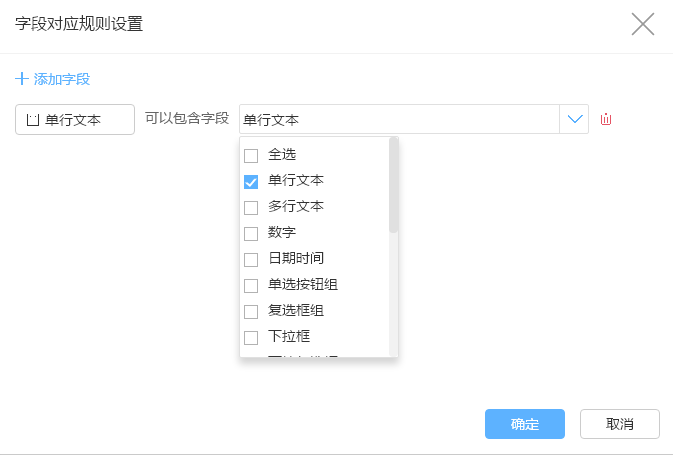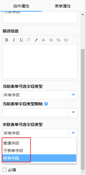 可选字段类型是限制当前表单的字段类型,可选字段类型目前支持:普通字段、子表单字段以及所有字段(子表单字段和普通字段)。