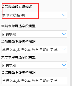 需配合【表单来源】字段一起使用,可以设置当前表和关联表的可选字段类型。