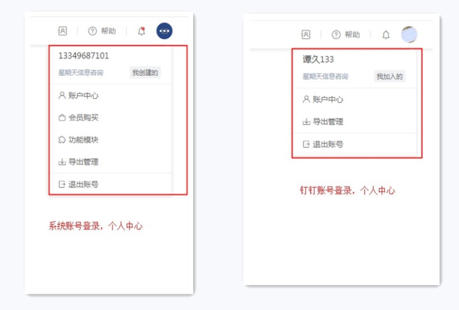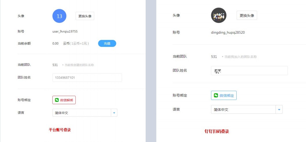云翼运维账号和钉钉扫码登录系统,在个人中心的功能不一致。