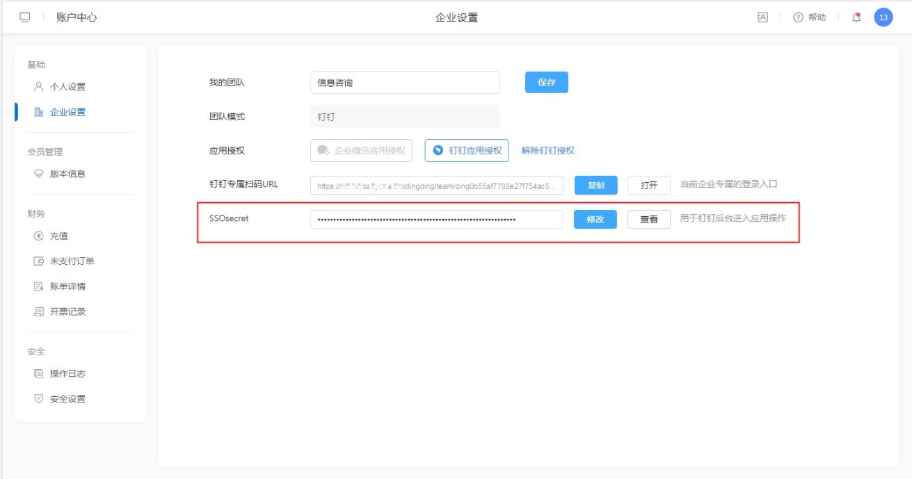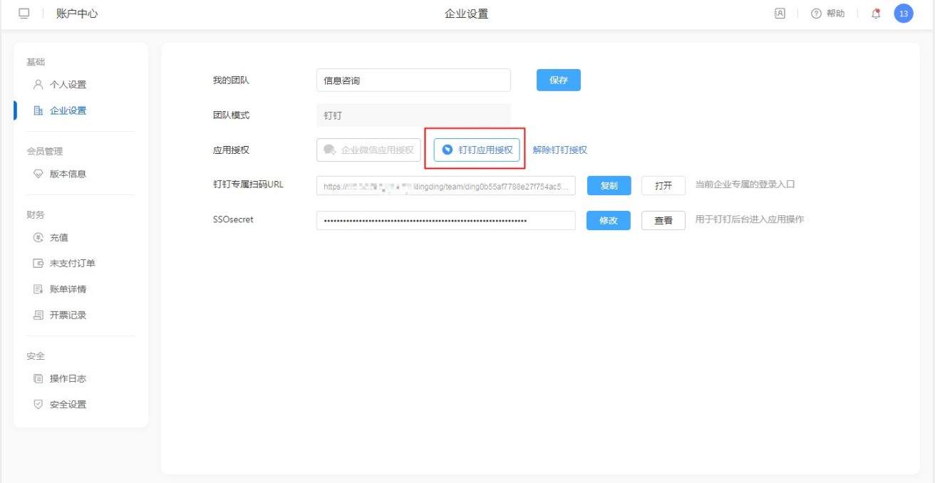 用户通过云翼运维账号登录系统后,进入【右侧头像】-【账号中心】-【企业设置】,在企业设置中可以进行钉钉应用授权。
