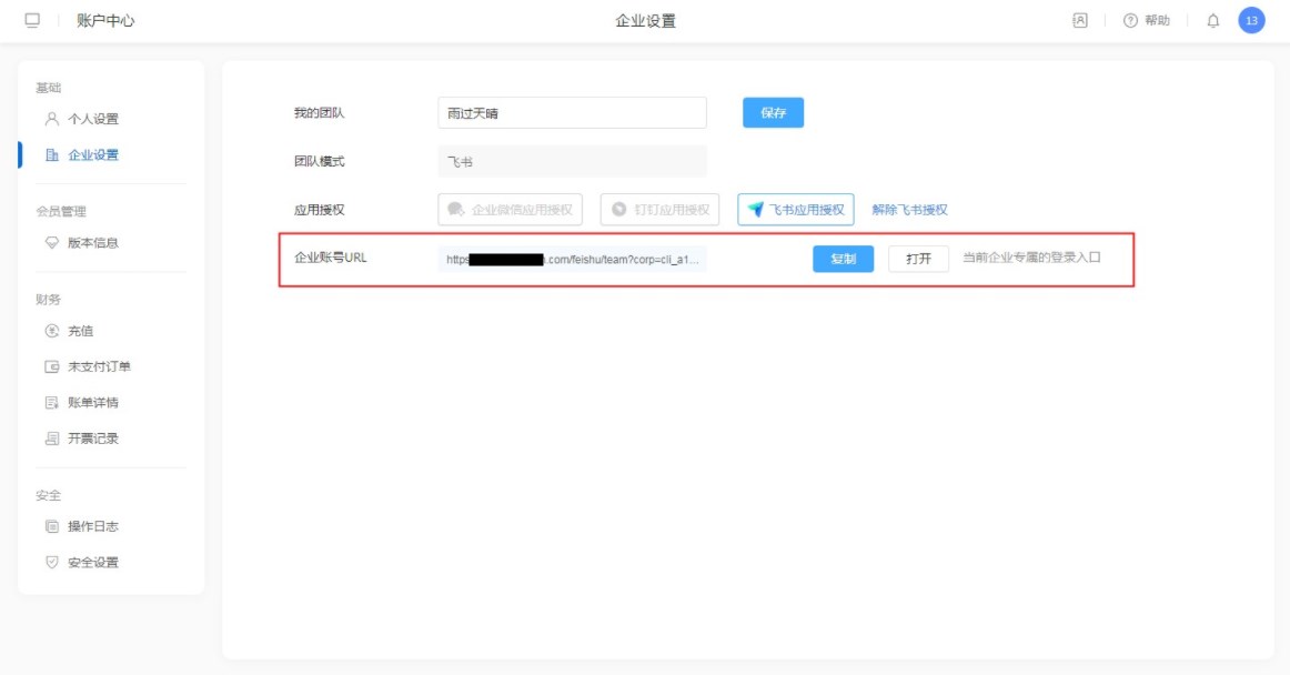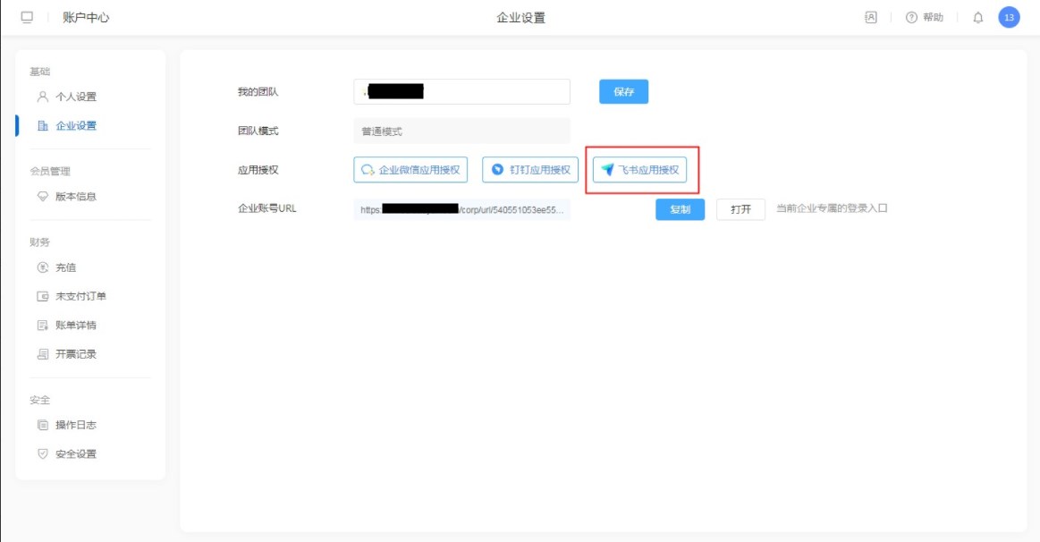 云翼运维账号登录系统后,进入【右侧头像】-【账号中心】-【企业设置】,在企业设置中可以进行飞书应用授权。