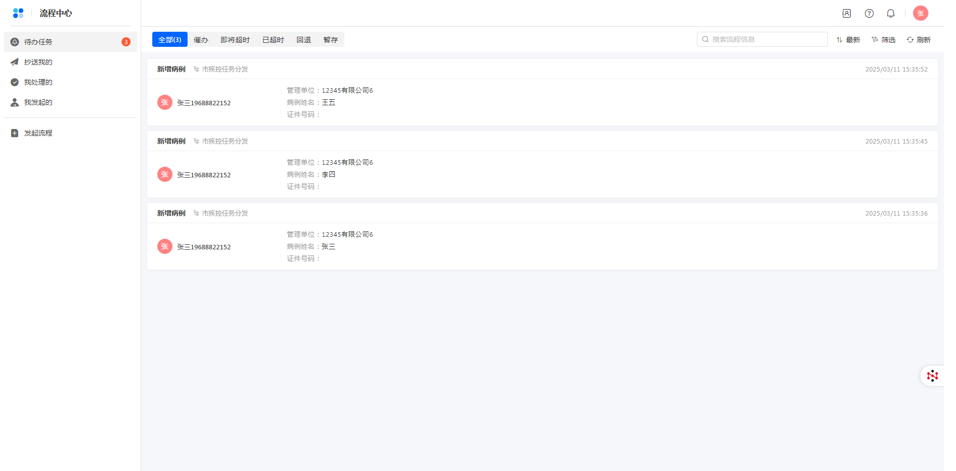 待办任务下还统计了所有催办、即将超时、已超时的流程,方便快速处理。