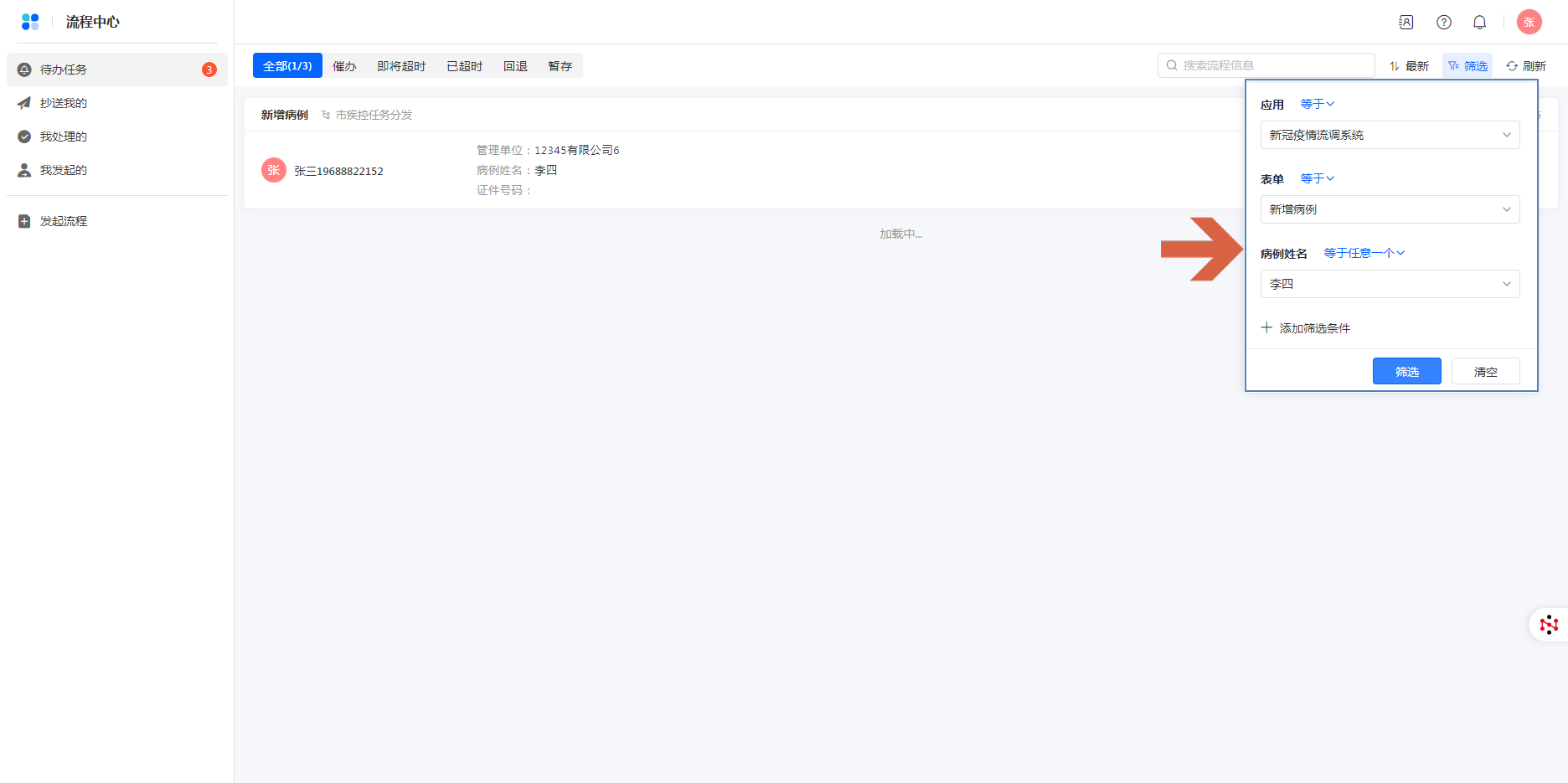 • 流程中心可使用搜索和筛选功能,筛选数据。