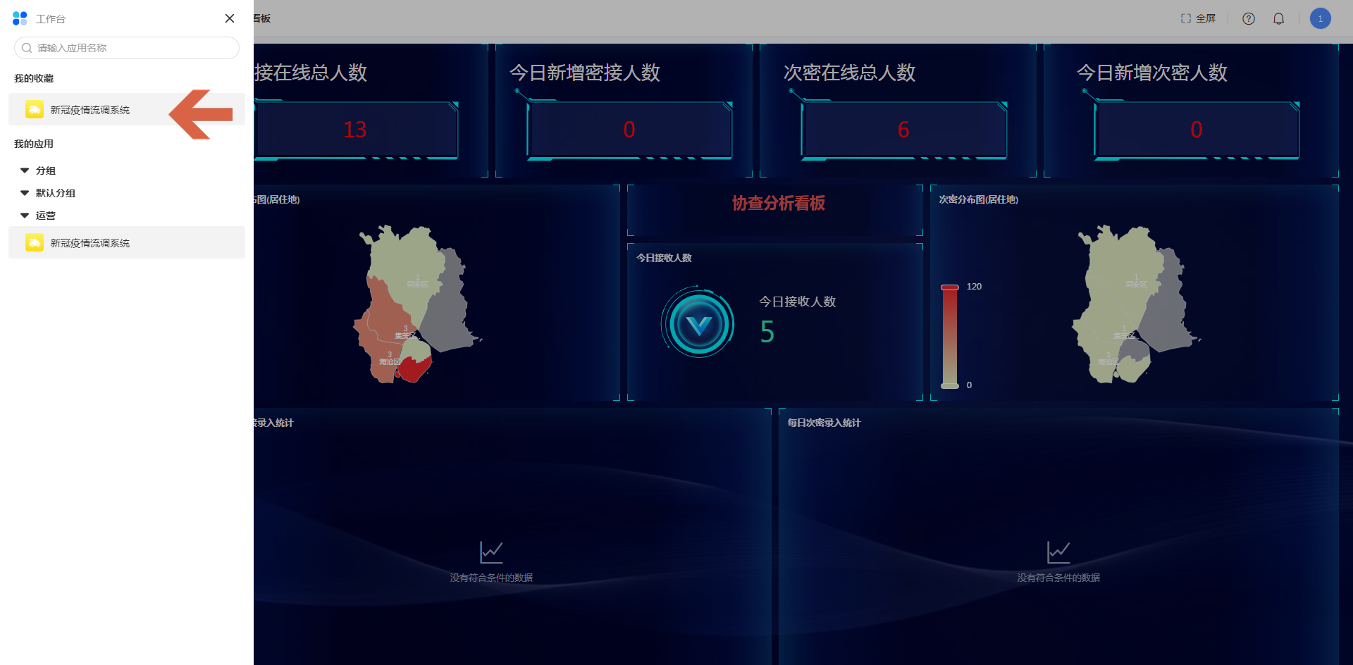 在访问应用的过程中,点击左边侧边栏可以直达“我的收藏”,将常用应用添加至我的收藏后,不用返回工作台即可完成业务之间的切换。