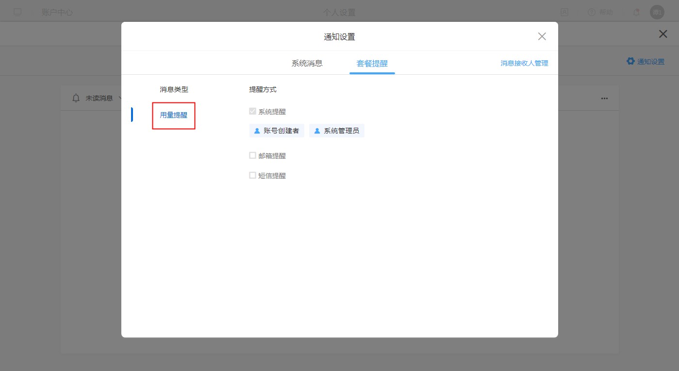 • 设置方式:勾选邮箱提醒方式,默认发送给账号创建者,还可以设置接收人,接收人可以在消息接收人管理中设置。