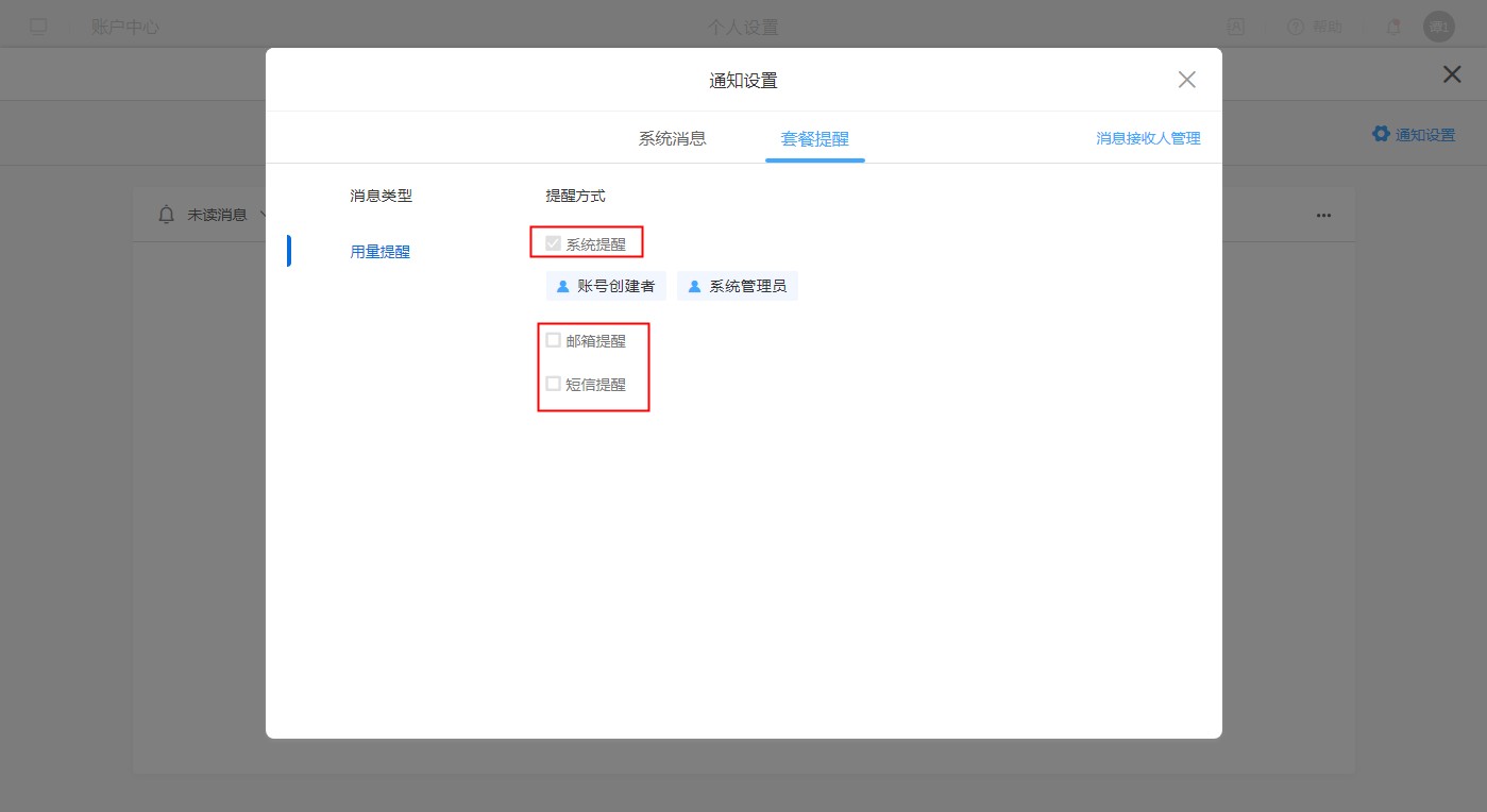 • 设置方式:勾选短信提醒方式,默认发送给账号创建者,还可以设置接收人,接收人可以在消息接收人管理中设置。