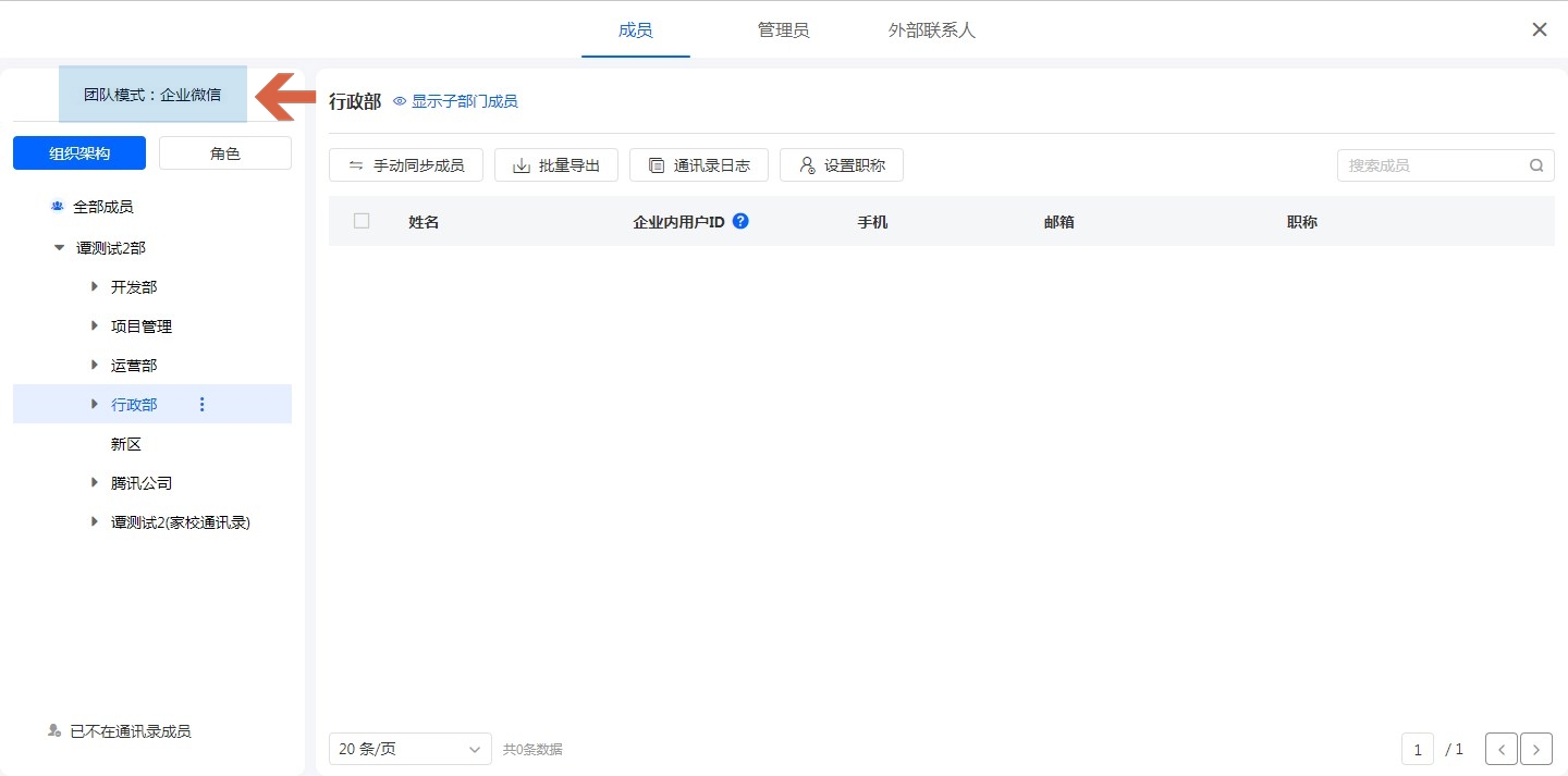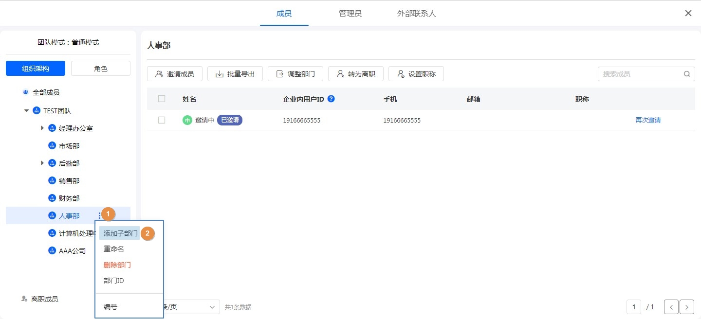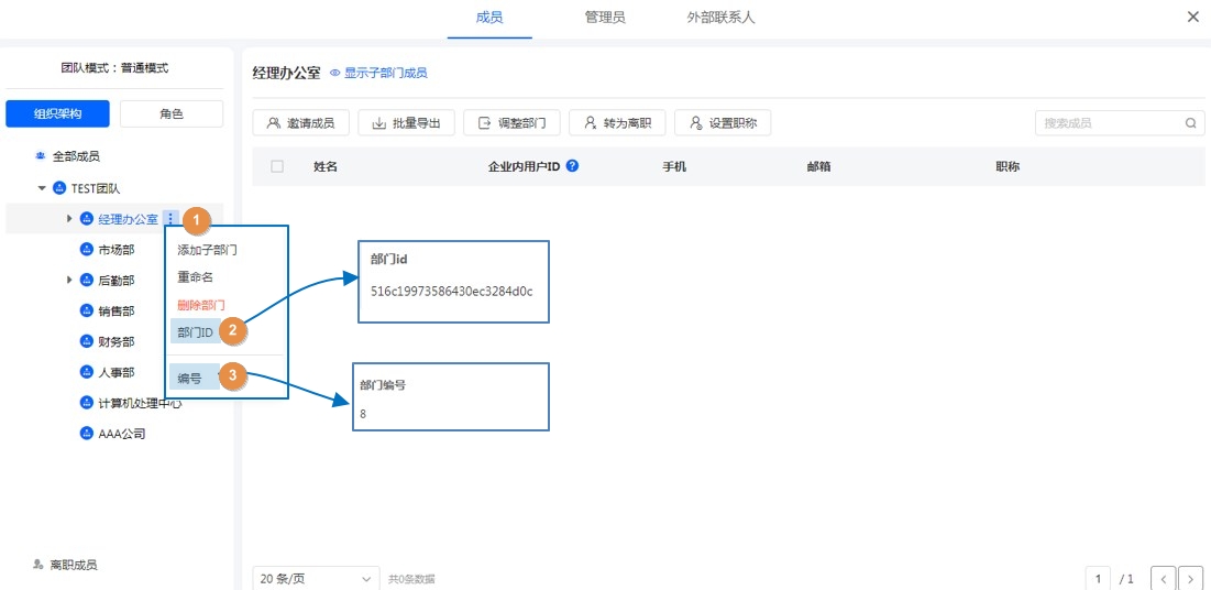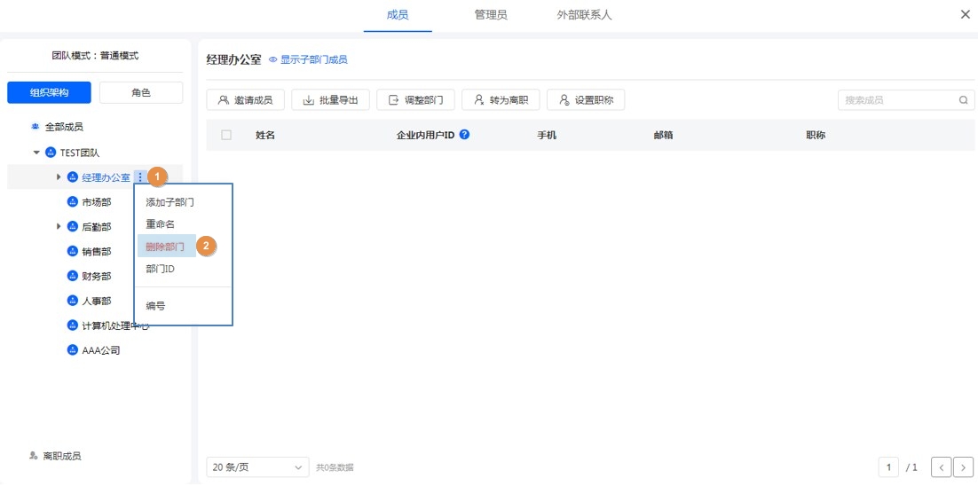 - 如果该部门内有成员,需要先将成员移动至其他部门才可删除这个部门。