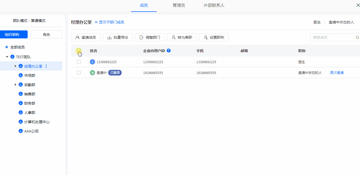 在普通模式下,可以通过通讯录直接为企业组织添加成员,便捷的管理公司人员。