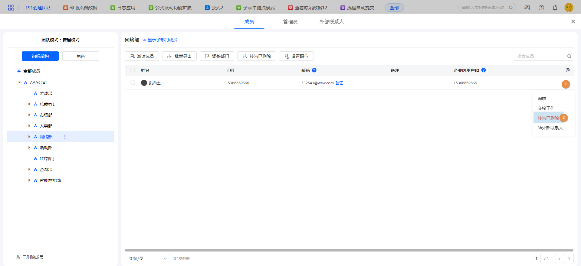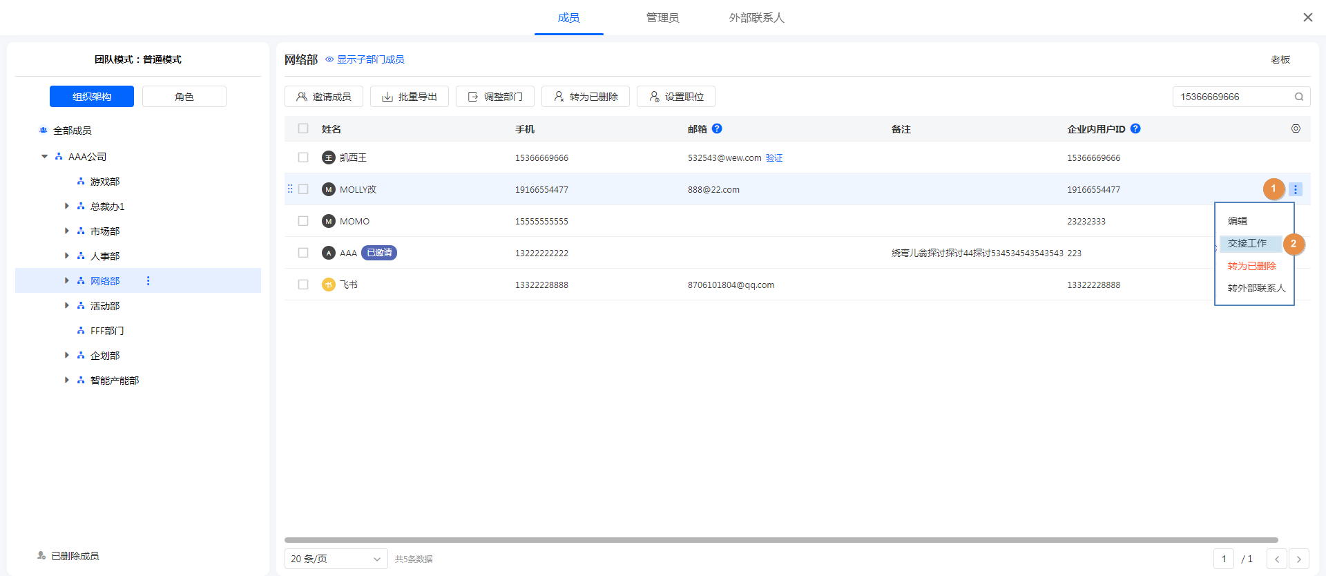 当员工离职后,常常需要对离职员工进行成员删除处理,可直接在成员页面进行成员的离职操作,离职完成的员工会进入【已删除成员】中。