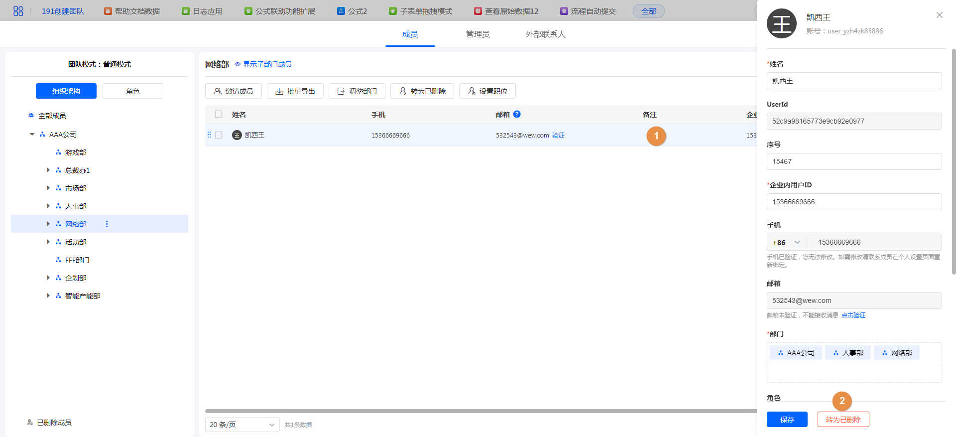 成员记录右侧的删除成员入口进行离职操作 编辑成员信息时进行删除操作