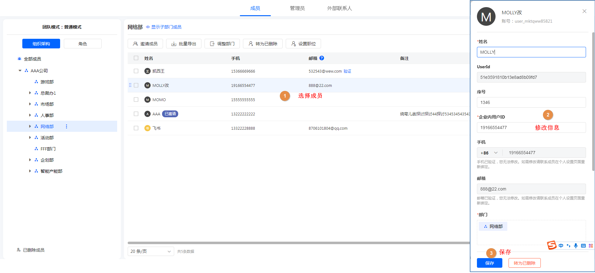 通讯录页面点击单条成员数据可以查看详情并进行姓名/企业ID/手机/邮箱/部门/角色/职位等信息的修改。