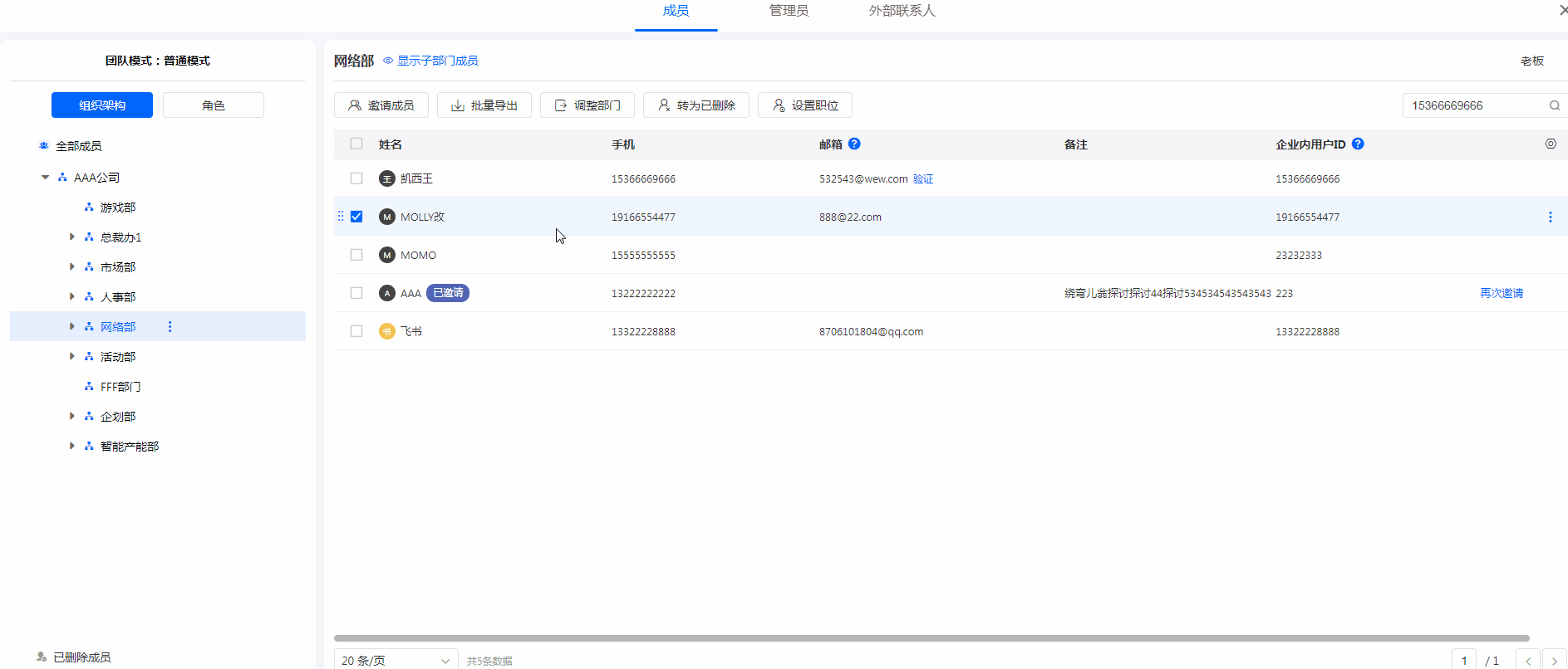 如需对员工进行批量调整部门,可通过在通讯录中选择需移动的成员,进行批量移动。