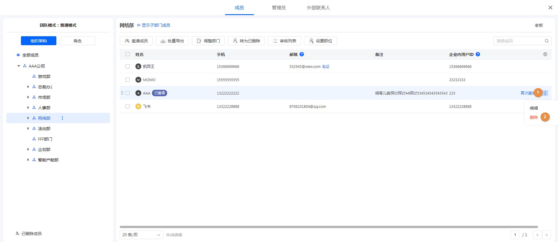 • 邀请中状态的成员会被直接删除,不会进入已删除成员列表
