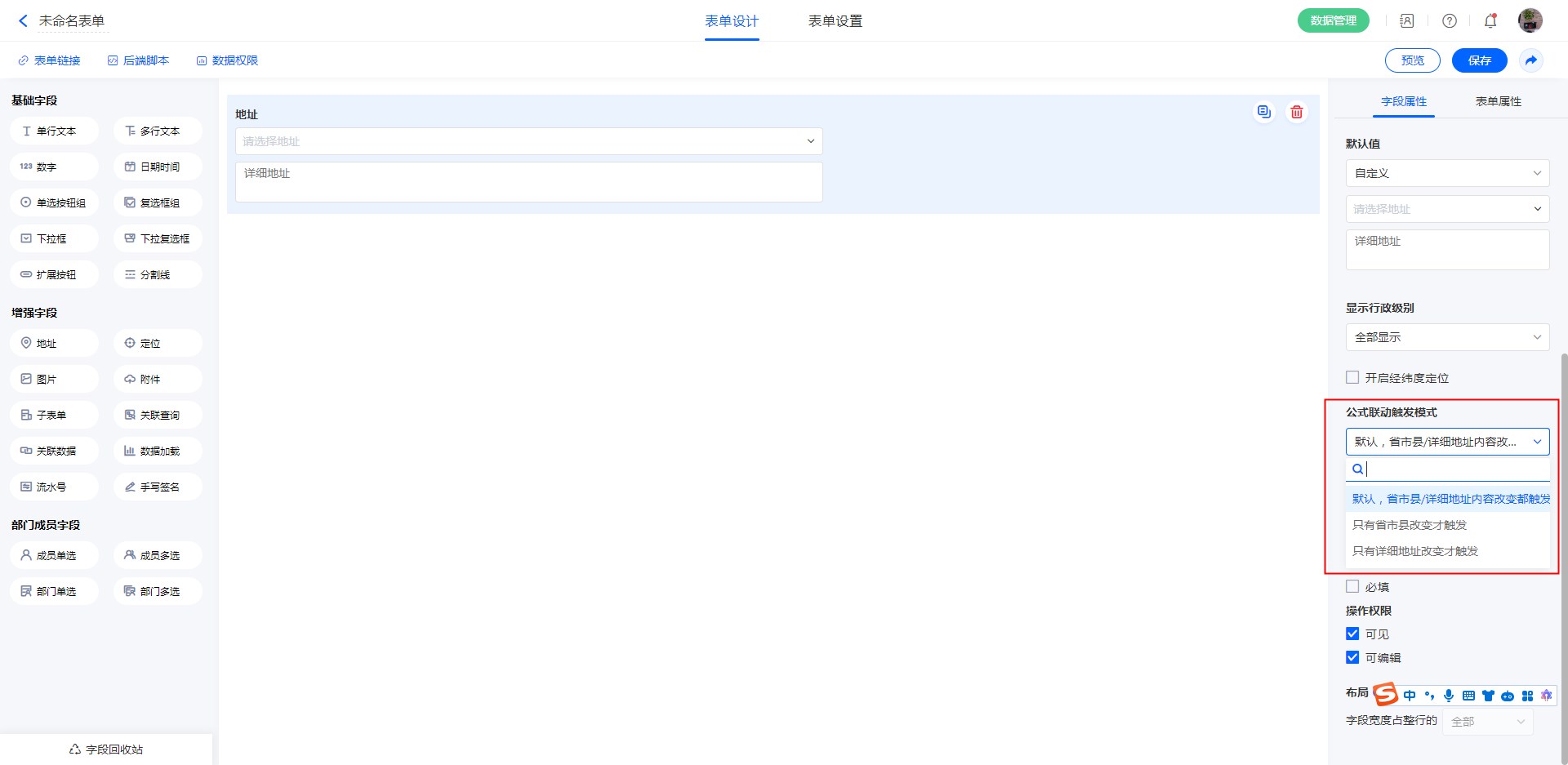 当地址字段内容改版触发控件扩展或相关公式联动时,按配置的模式进行触发。之前的版本是省市县/详细地址内容改版都触发。