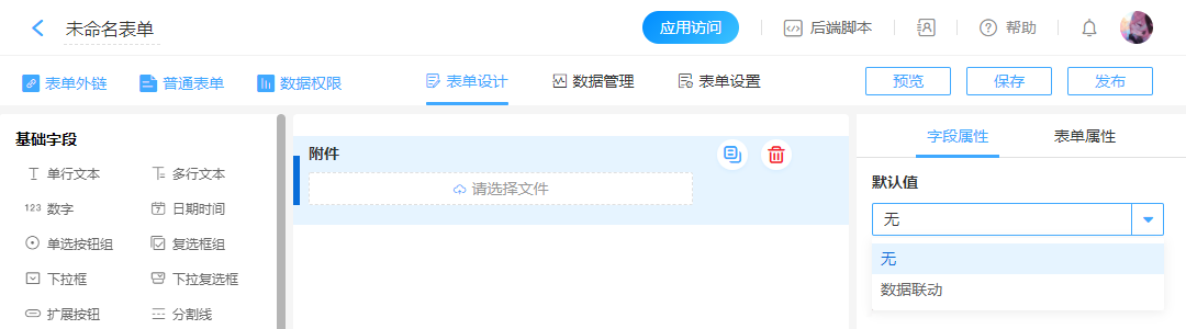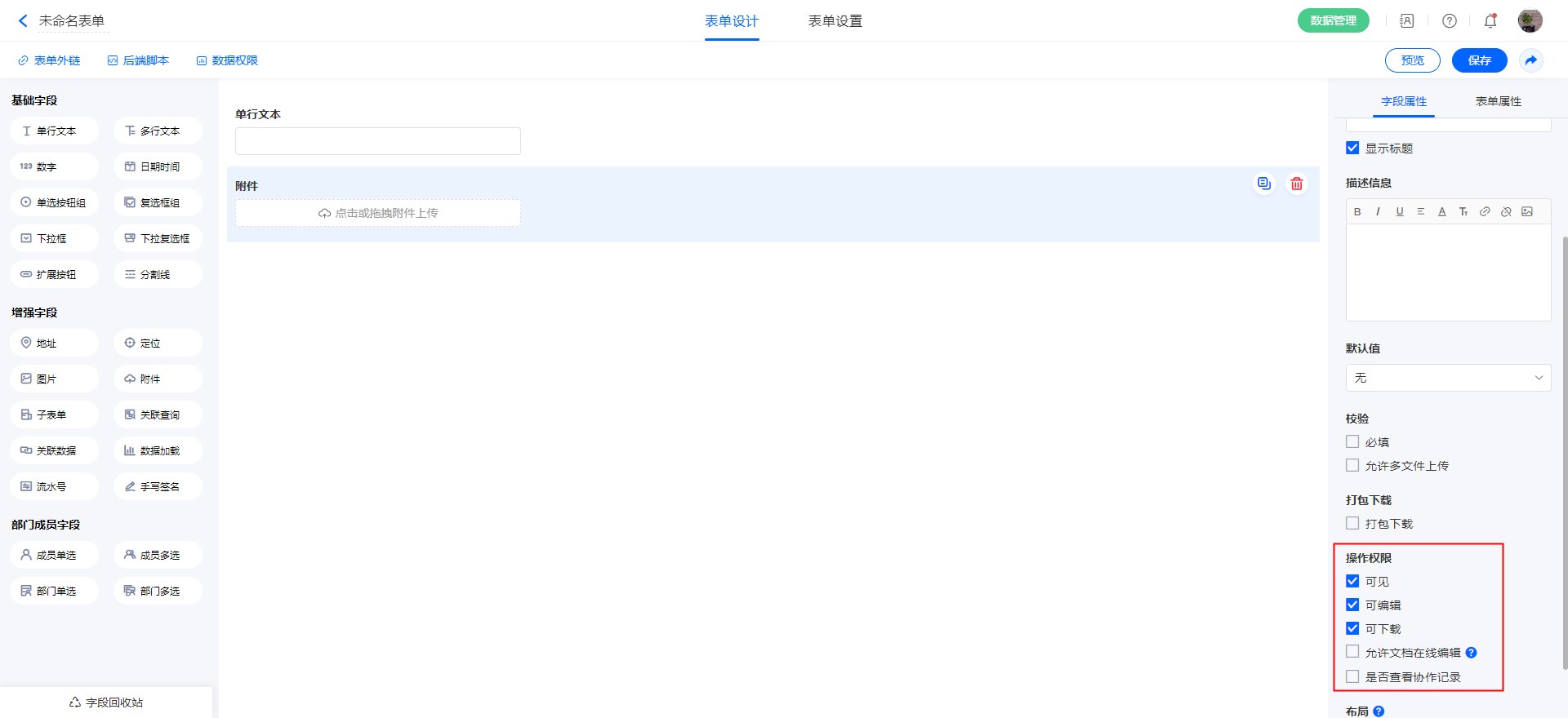 • 表单权限组访问,查看数据或者编辑数据页面,附件字段权限由表单权限组决定。