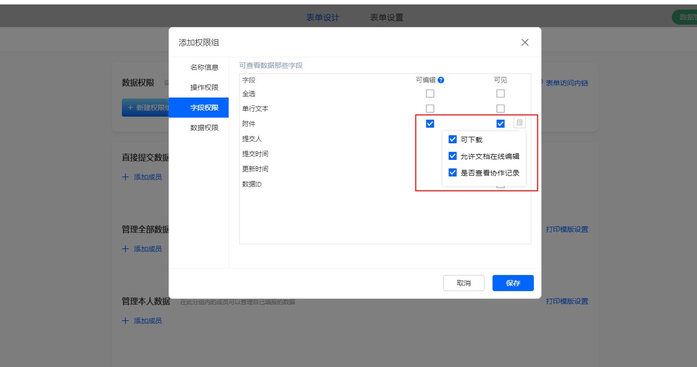 如:表单权限组设置附件字段 允许文档在线编辑 权限
