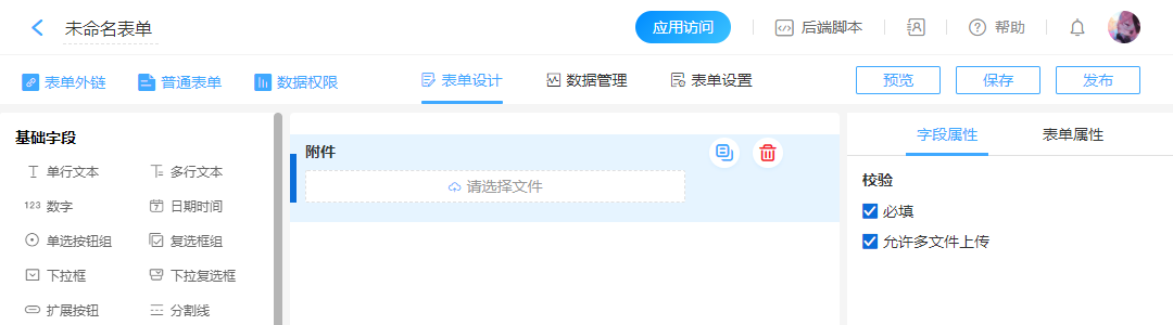允许多文件上传 勾选启用,填写表单时可以上传多个附件。