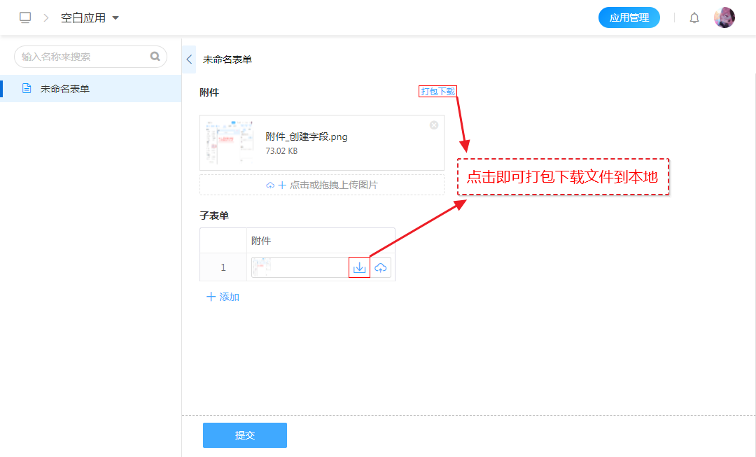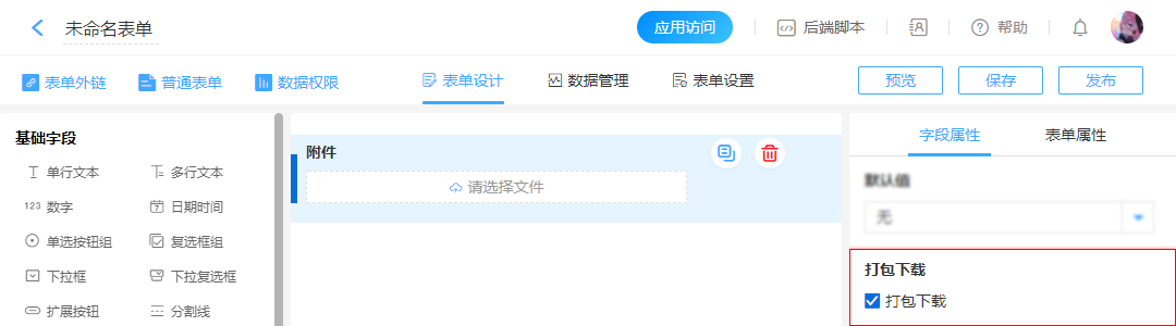 勾选[打包下载] 填写表单时,上传附件后,会出现[打包下载]按钮,点击即可将附件打包下载到本地。