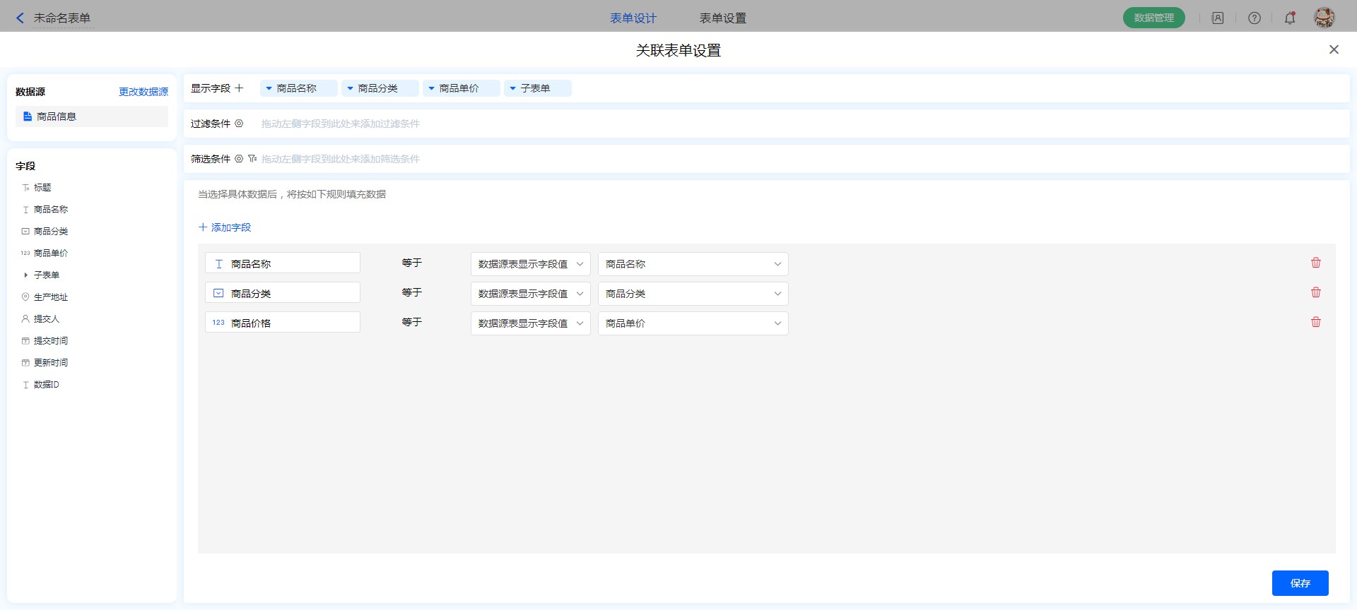 2. 如果显示字段中添加了子表单,当数据源表中新增字段后,需在【子表单】——【子表单字段设置】——【选择显示字段】,设置字段显示后才可显示成功。