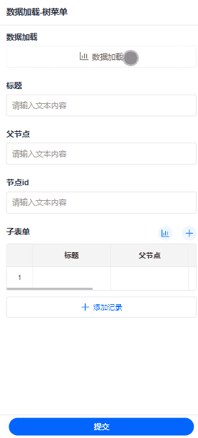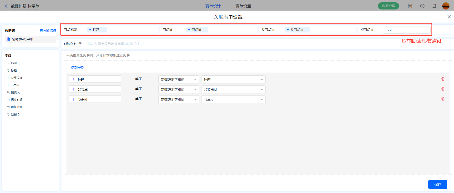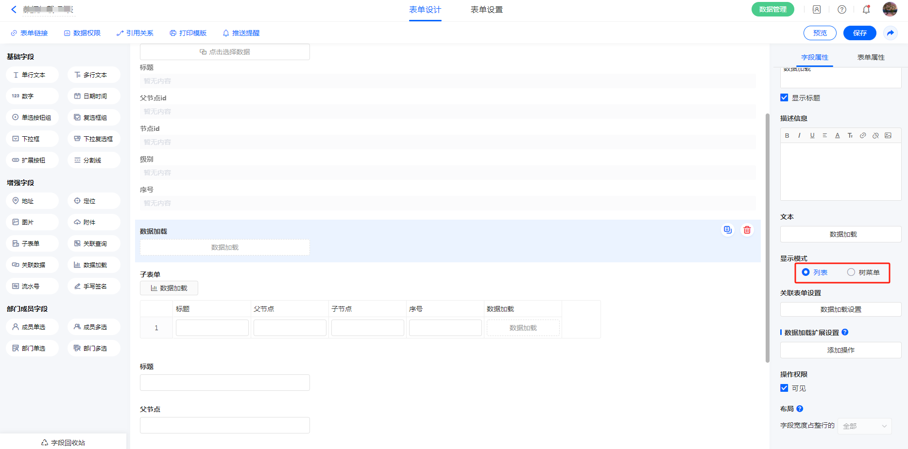 进入表单设计界面,拉取【数据加载】字段,字段属性>>显示模式选择【树菜单】,点击关联表单设置>>【数据加载设置】配置数据源 选择节点信息设置填充规则。