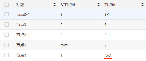 • 根据【节点ID】和【父节点ID】形成树形结构,通过根节点ID拉取首批节点,展示项为标题