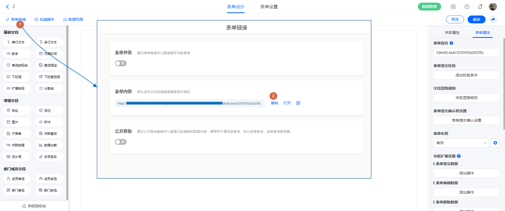 操作步骤:打开表单“设计页面” >表单链接”,即可获取内链地址。