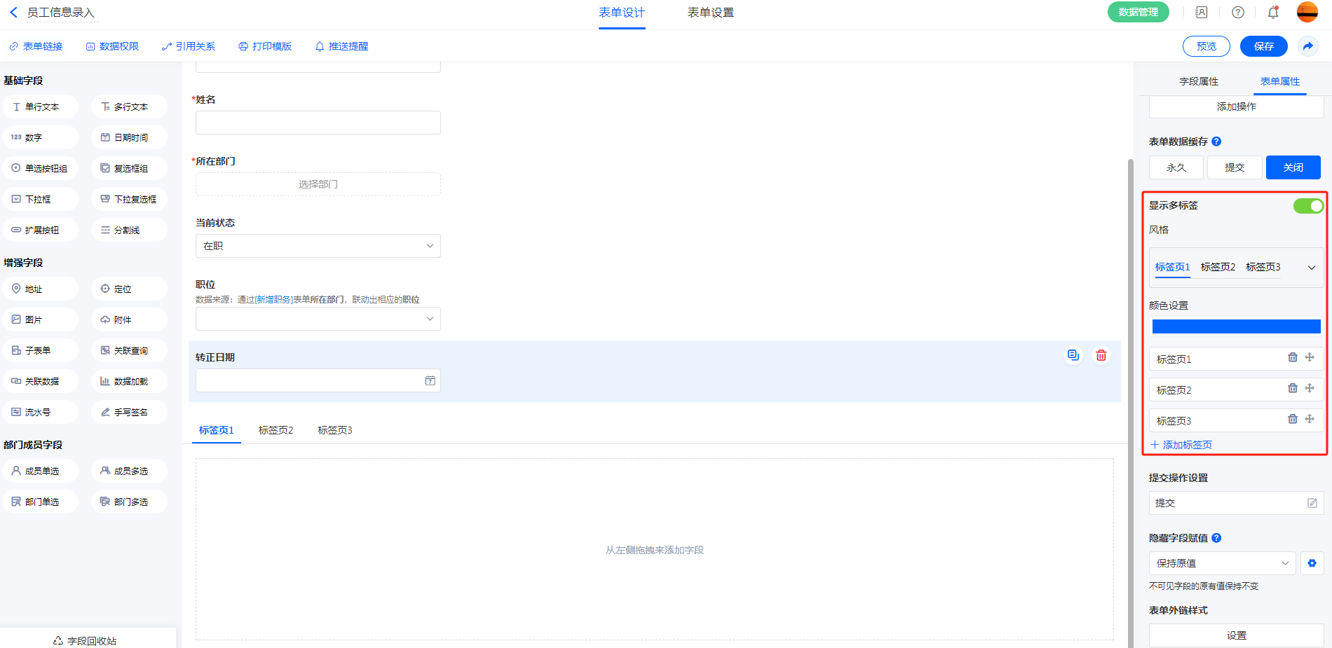 操作步骤:表单编辑页面->表单属性->多标签显示->开启。