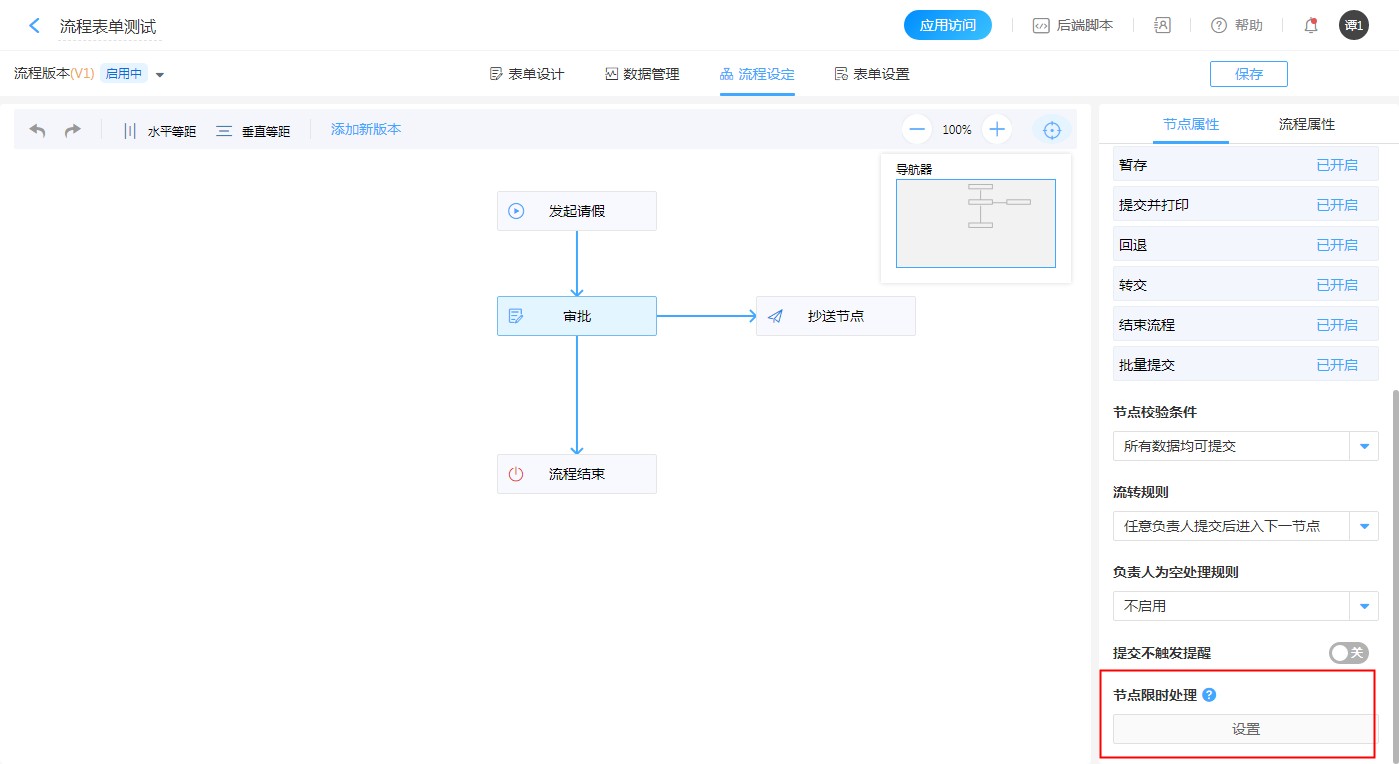 如果流程表单的流程节点设置了限时处理,那么在流程节点管理里可以设置显示处理的负责人、抄送人以及被提醒人。