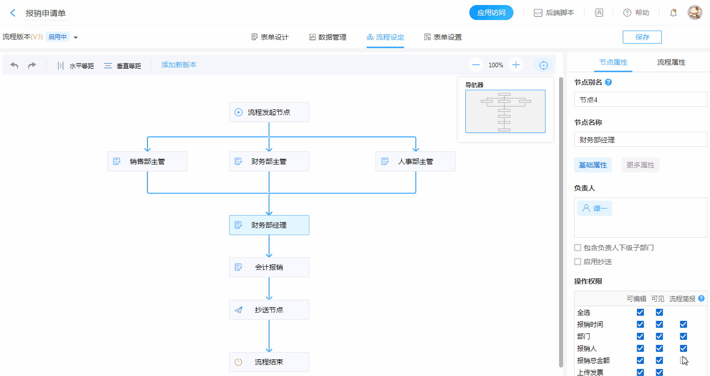 操作步骤:流程表单设计页面 > 流程设计 > 选择对应的流程节点 > 节点属性下设置负责人。