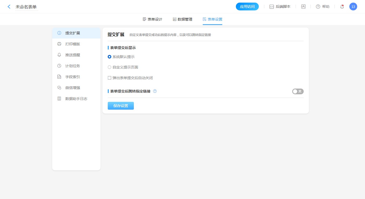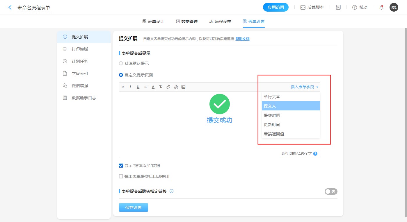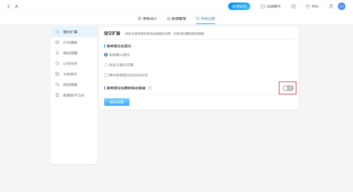 • 步骤:【应用管理】—【表单设计】—【表单设置】
