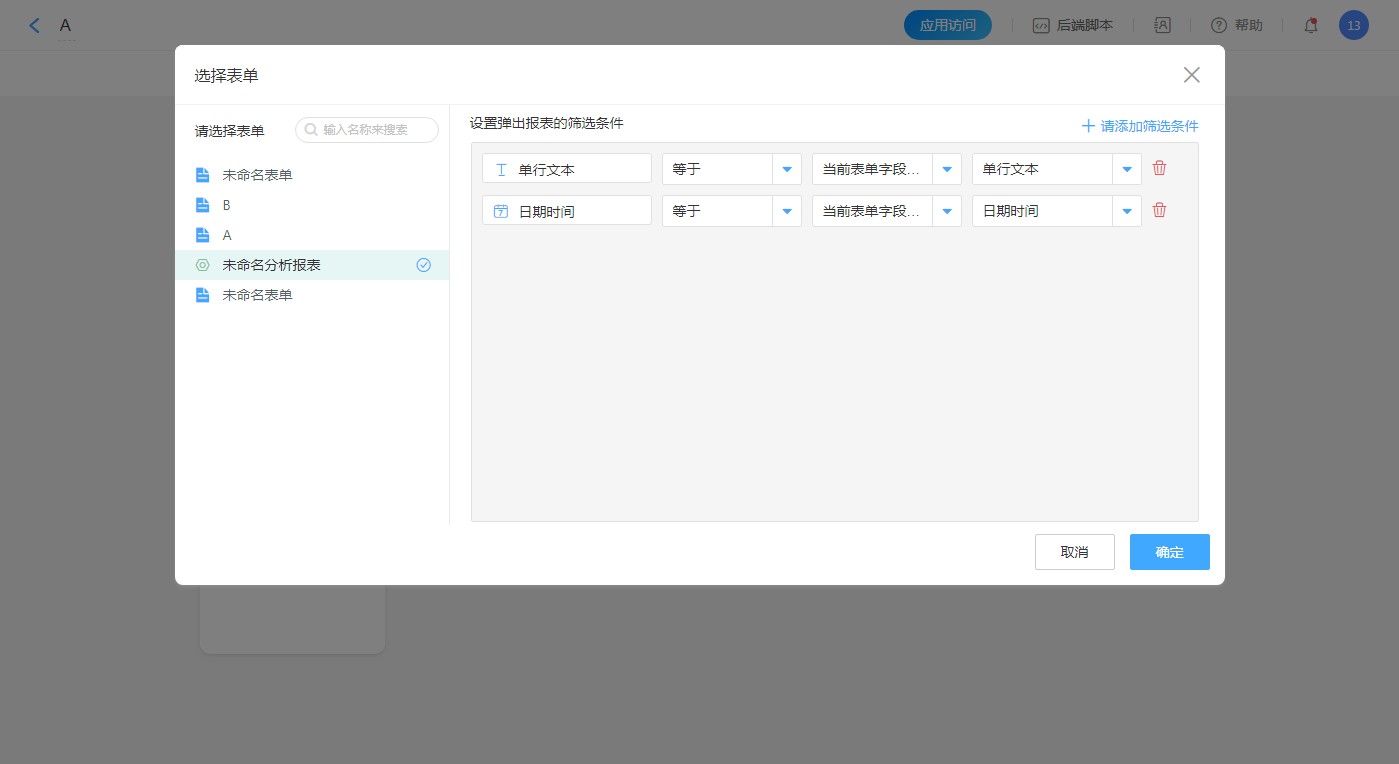 • 点击选择表单弹出弹窗,在弹窗中选择表单或报表。