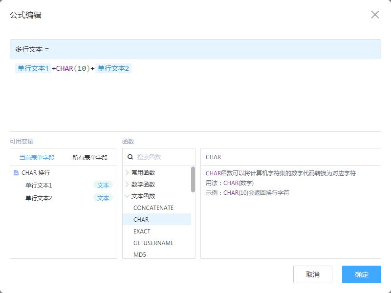"姓名:张三"+CHAR(10)+"年龄:20") - 输出: