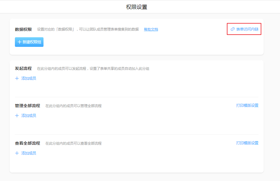 数据权限不仅可以进行权限分配,还可开启【表单内链】,表单内链也是根据权限进行访问。