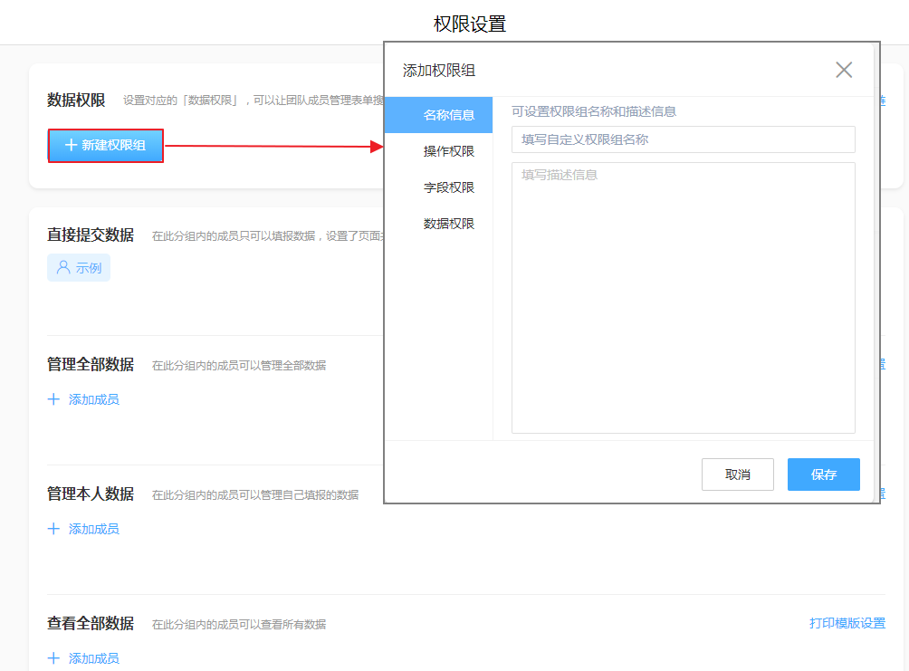 注意:如果有多个权限组设置了同一个成员,那么该成员将拥有设置了该成员权限组的所有权限,具体情况可参考:数据权限自定义权限组合并。