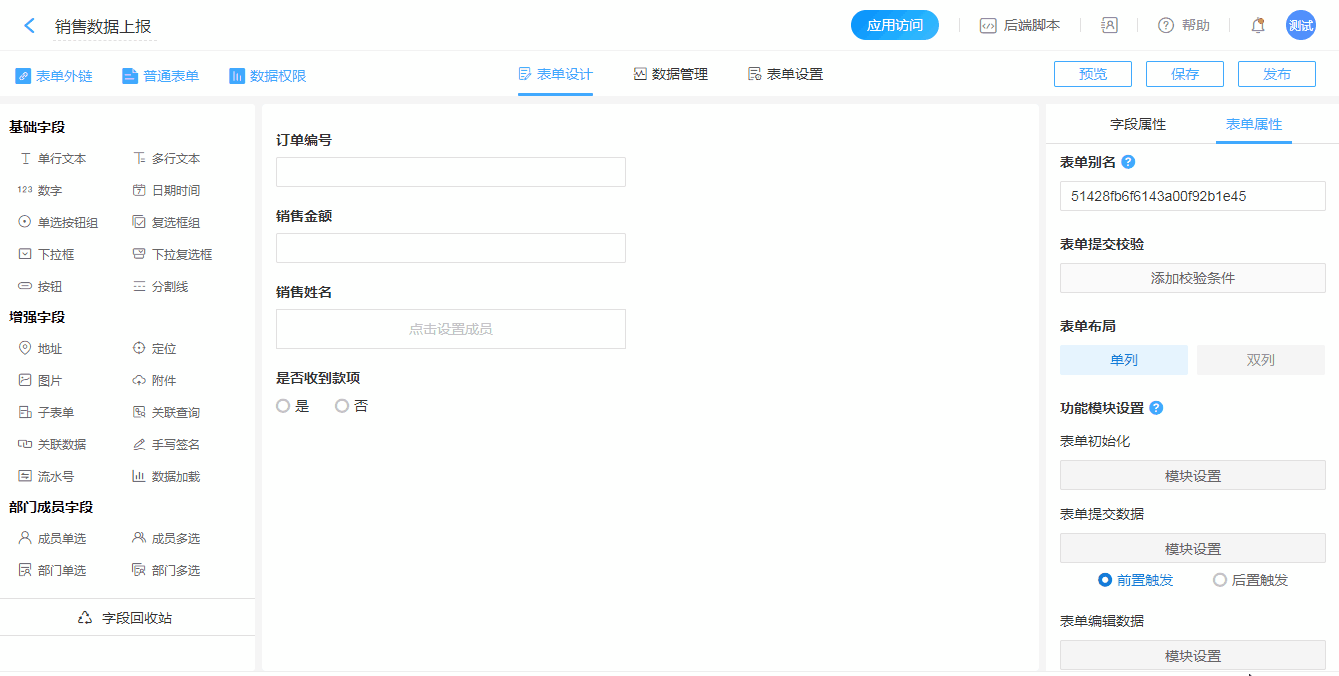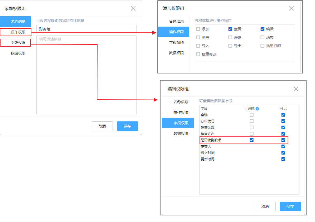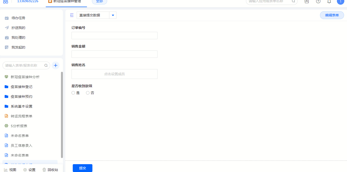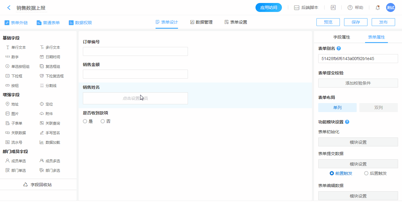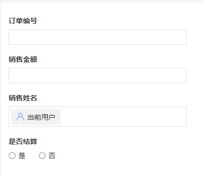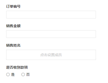 • 对除【是否收到款项】不可编辑不可见外其他所有字段都可见,但只能编辑【订单编号】【销售姓名】【销售金额】。