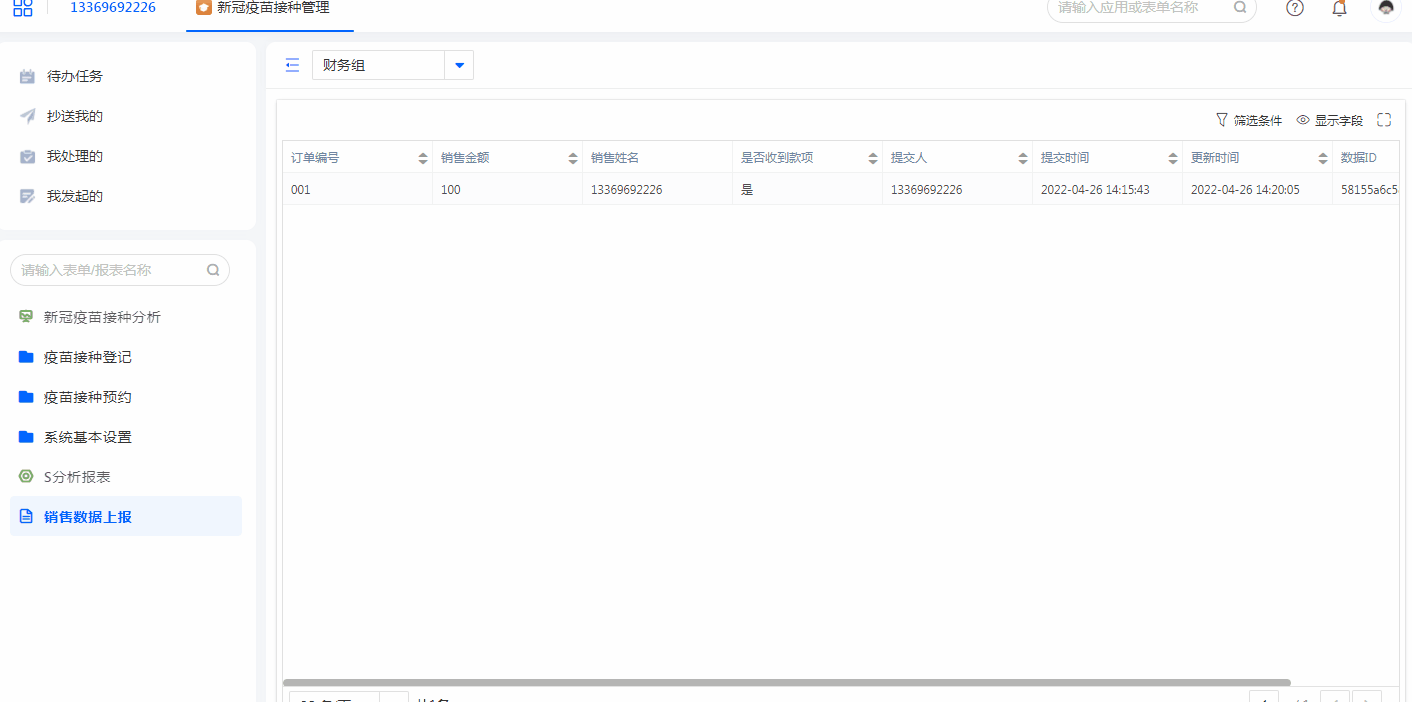③ 看一下实际效果,【登录财务部成员[示例]的账号】——【打开[销售数据上报]这张表单】——【切换至[财务组]权限组】: