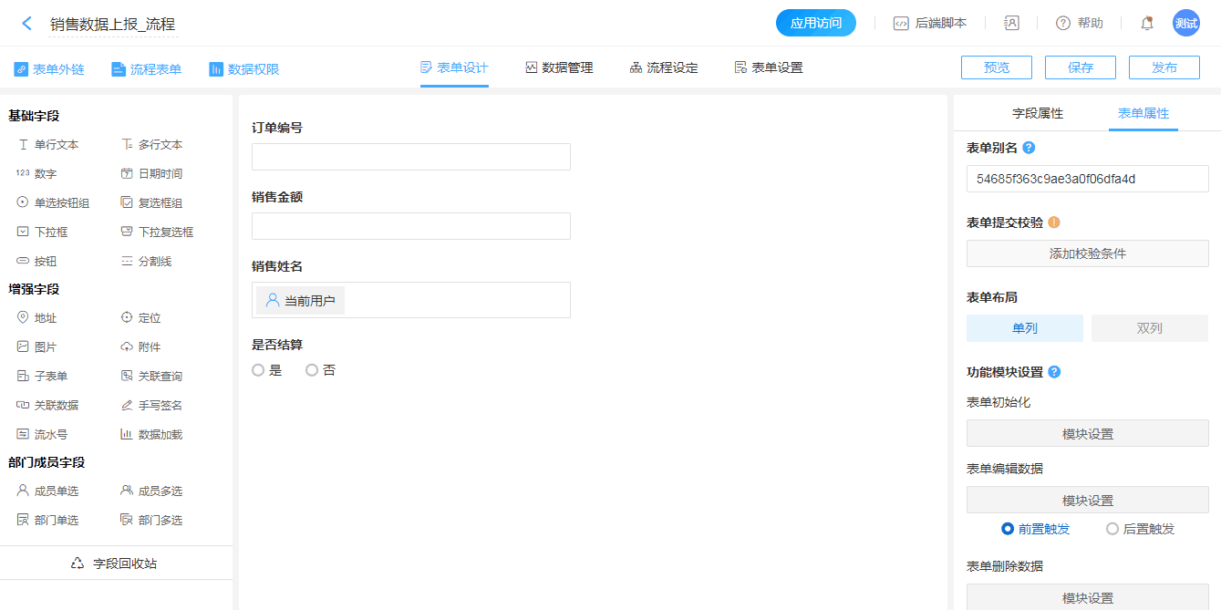 • 例如,一张销售数据上报的表单,包括【订单编号】【销售姓名】【销售金额】【是否结算】4个字段。