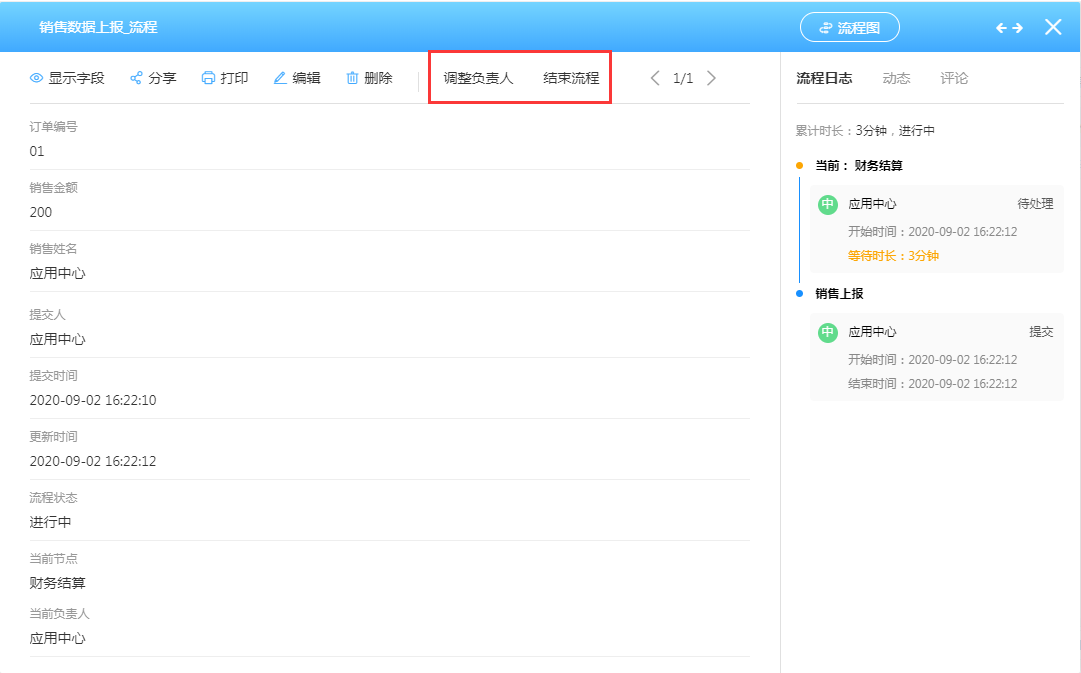 • 还可以添加、查看、编辑、删除、调整流程负责人、激活流程、结束流程、动态、评论、流程日志、批量打印、批量修改、导出。