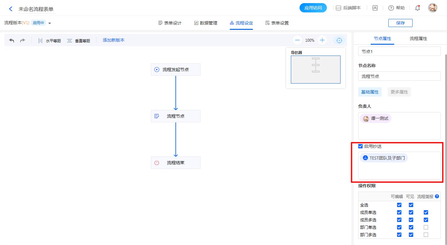 步骤:【新建抄送节点】——【设置负责人】——【操作权限】——【勾选可见字段与流程简报】