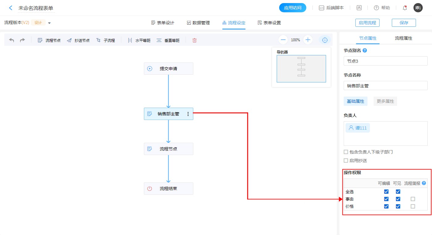 - 启用流程后,表单中的控件操作权限失效,仅遵循节点操作权限。、