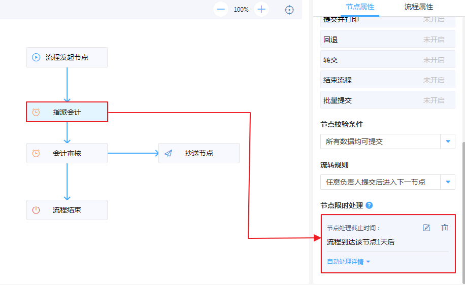 对流程节点设置了限时自动提交后,如果流程在该节点停留的时间达到自动提交时间,流程会自动向下流转。