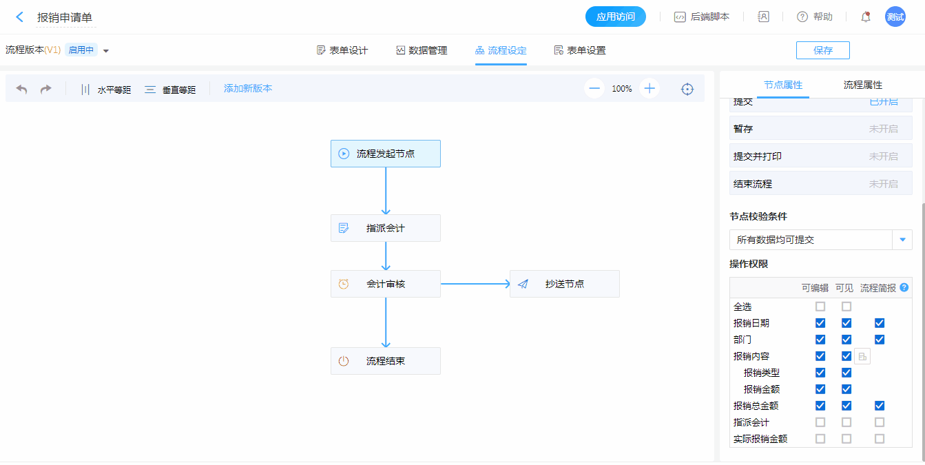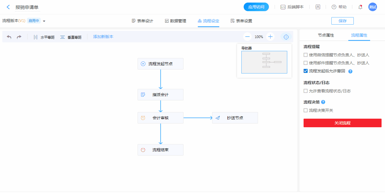超时不处理视为同意申请。那么就可以为「指派会计」节点设置超时1天后自动提交,如果主管工作量太大而不能及时审批,就可以自动通过,避免流程停滞不前,让流程可以畅快流转。